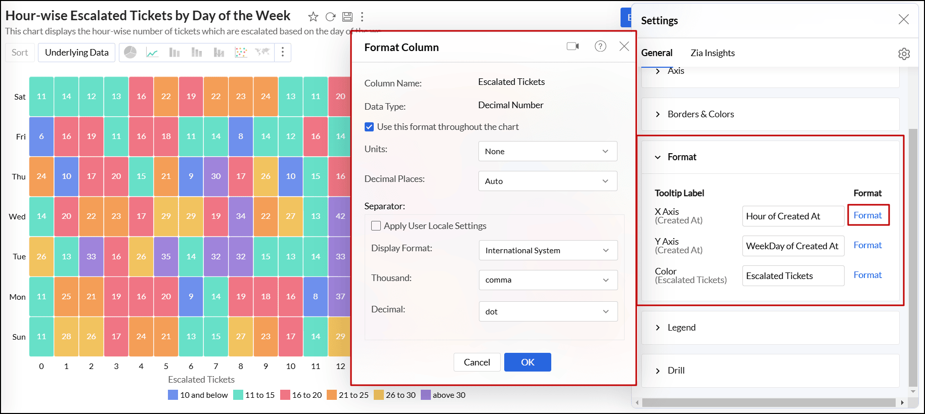 Analytics Plusでは、整合、小数点以下の桁数、日付形式、通貨記号その他のオプションを含め、列の形式を修正することができます。データタイプによっては、チャートへのデータの表示方法を選択することができます。