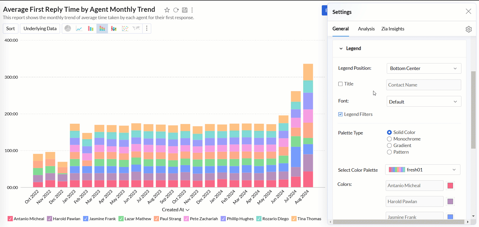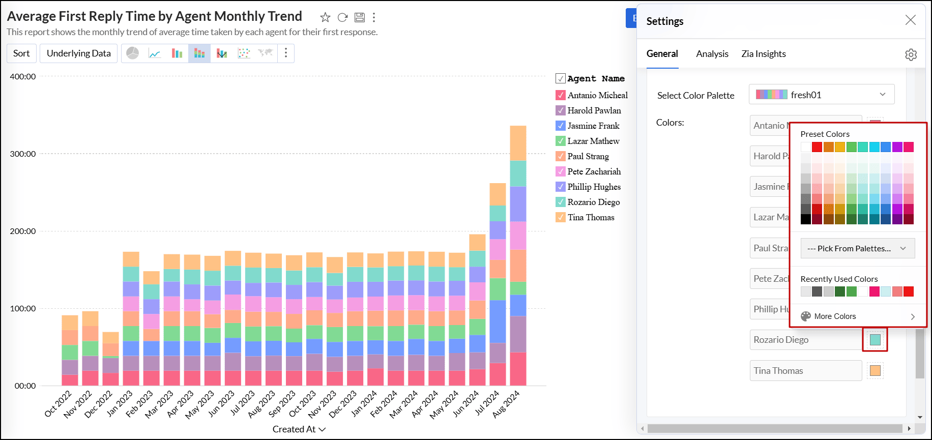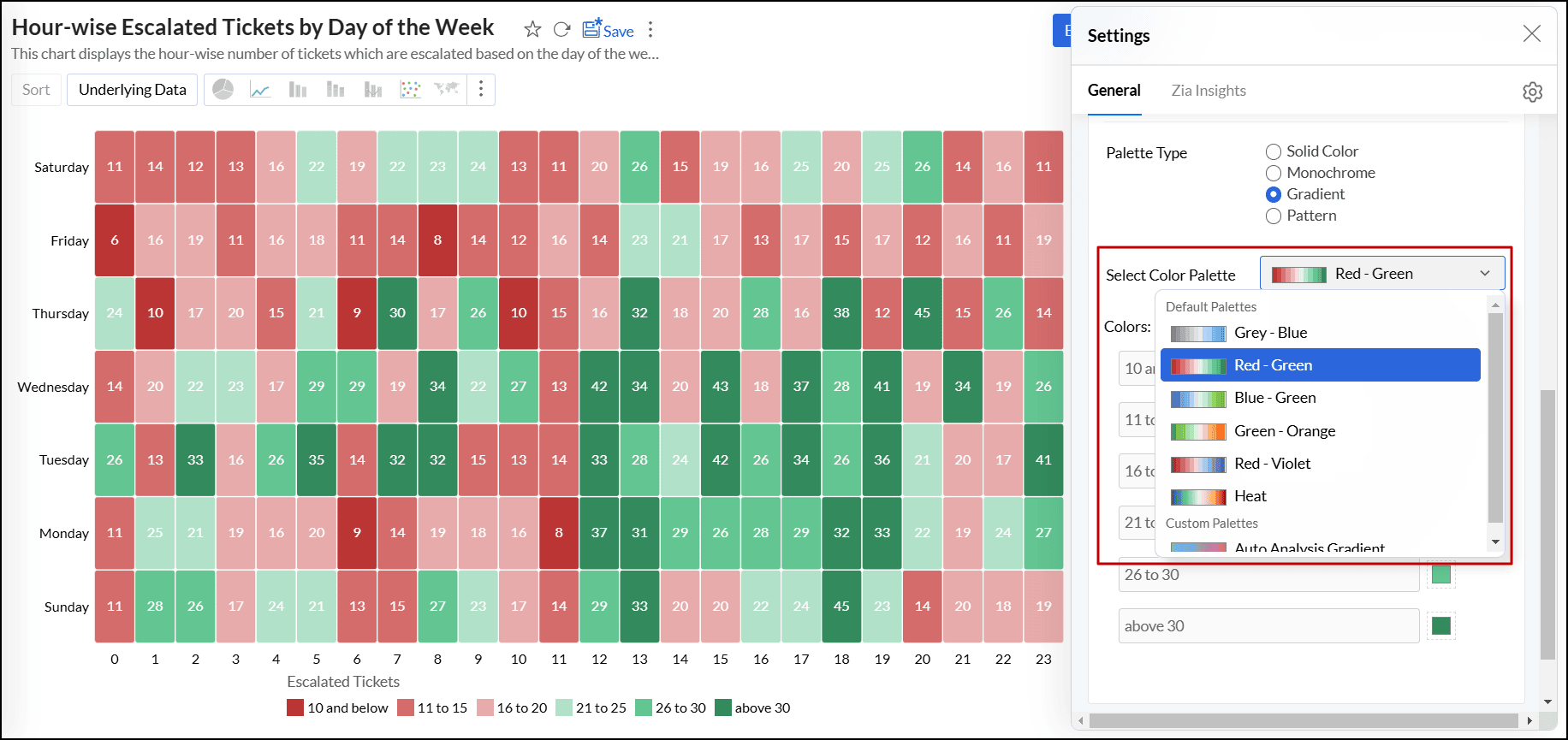 - カラーパレット:このオプションでは、お使いのデータ系列に適用するカラーパレットを選択できます。選択した Palette Typeカラーパレット (ソリッドカラー、モノクローム、またはグラデーション)に基づいて、パレットを選択できます。Analytics Plusには、カラーパレットの事前定義されたセットがあり、ニーズにあわせてカスタムパレットを作成および追加することができます。