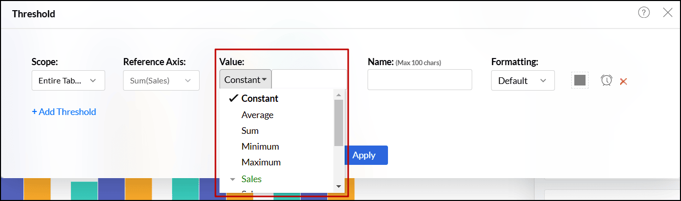 - 動的閾値は、基準軸の列の最小値、最大値、平均、または合計等、計算した値を表すのに描く基準線です。動的閾値線を追加するには、[値]ドロップダウンから関数を選択します。