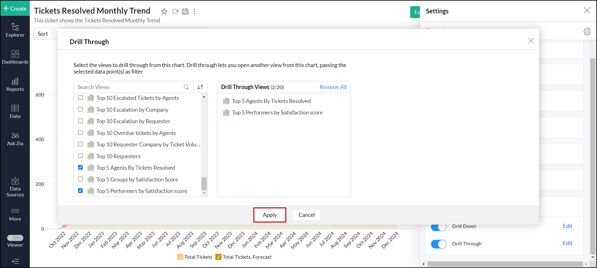 - 開いたダイアログで、現在のビューからドリルスルーが必要な関連ビューを選択します。