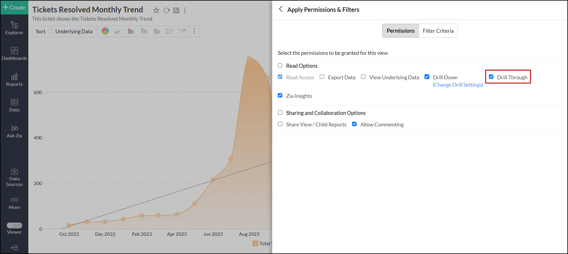 ビューの共有時、Analytics Plusで、レポート所有者は[ドリルスルー]オプションを有効にでき、他のユーザーに関連ビューのドリルスルー機能を付与できます。