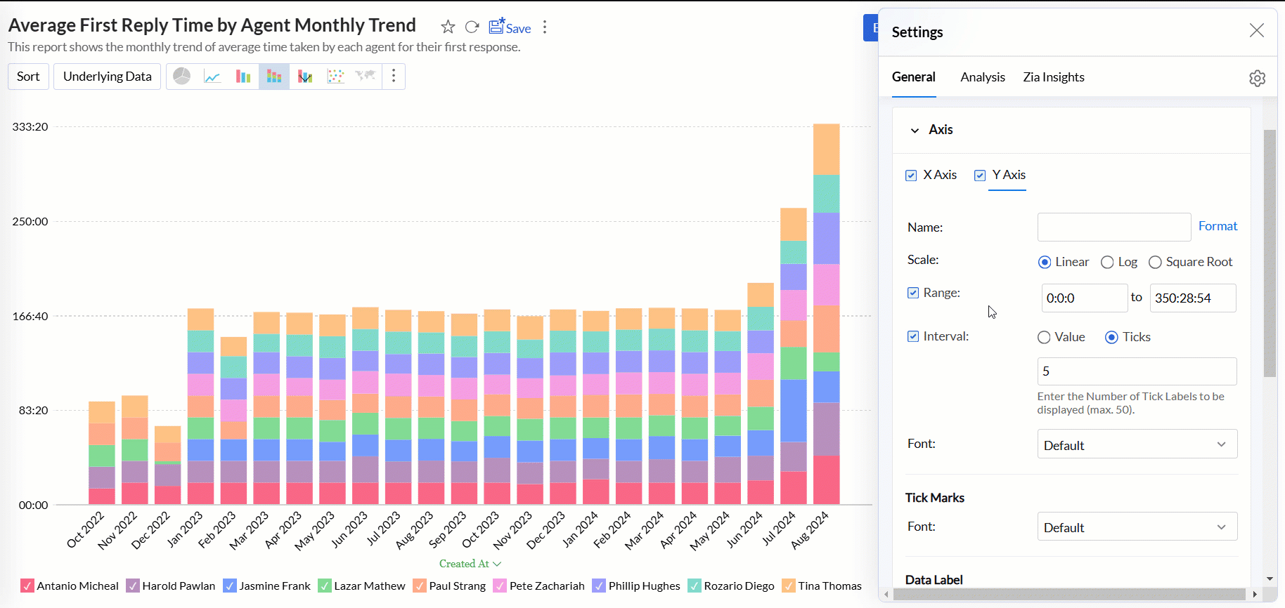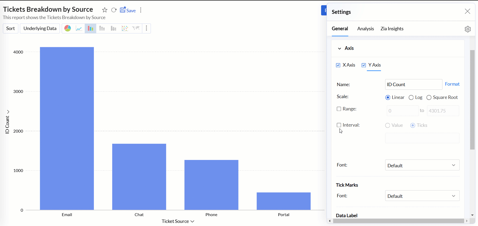 - 間隔:軸にそったチェックマークまたはラベルとの間のスペースまたは距離のことです。Analytics Plusは、軸ラベル長とチャートサイズに基づいて、これを自動決定します。[間隔]チェックボックスを選択し、以下のオプションのうち1つを選択することで、カスタム間隔を設定することもできます: