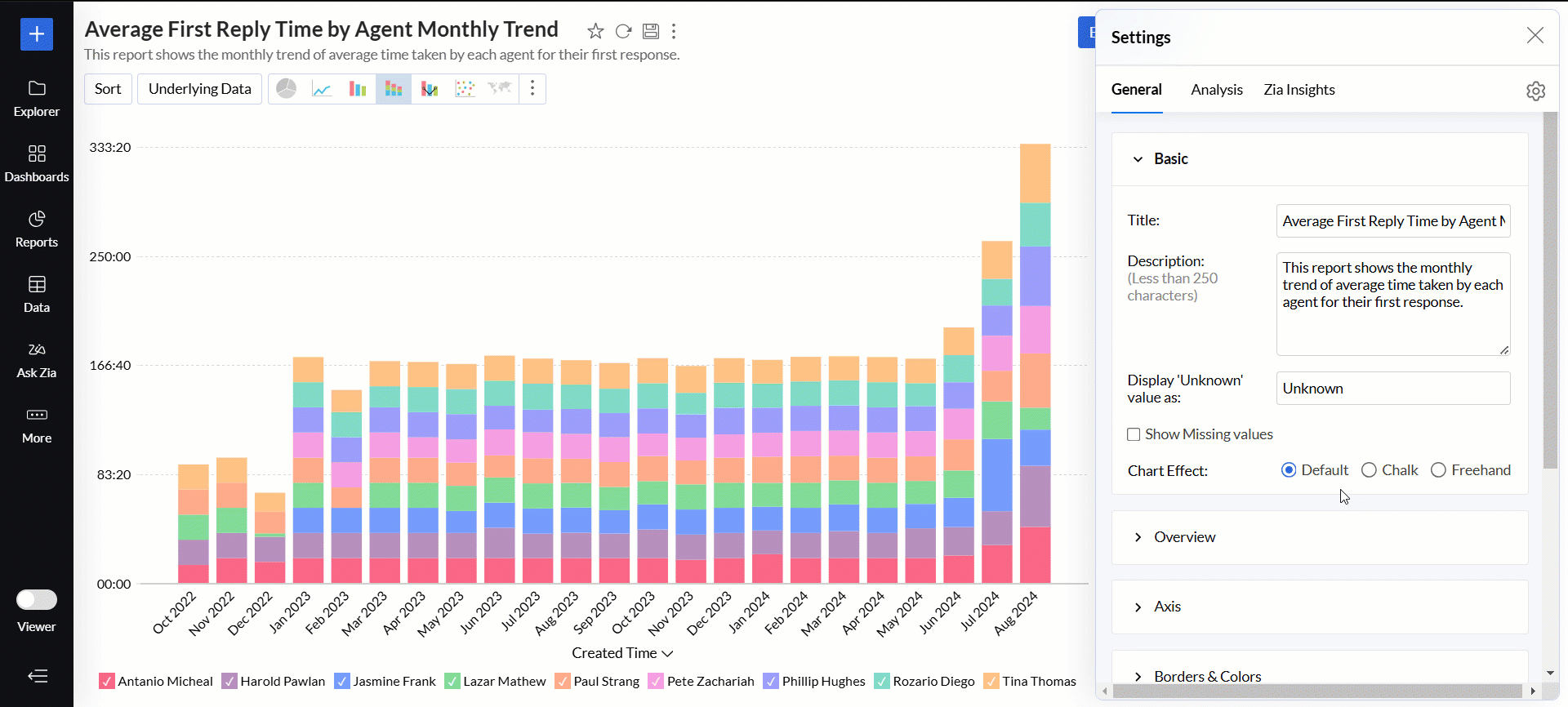 Analytics Plusには、各種のカスタマイズオプションがあり、チャート外観のパーソナライズが可能なため、見やすく情報を的確に伝えられます。色、フォント、およびレイアウトを調節して、ブランディングや環境設定を一致させることができます。
