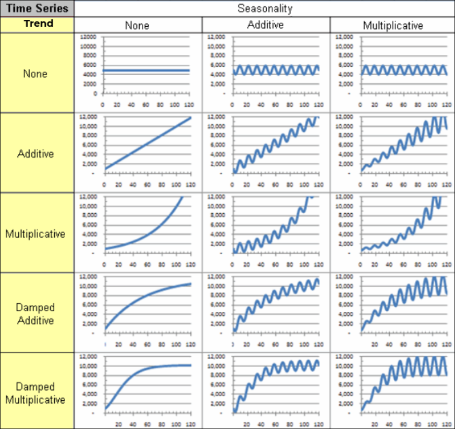 Analytics Plus の予測エンジンは、さまざまな種類の時系列データに対して、さまざまな指数平滑化法を提供します。次の図は、ETS モデルを生み出すさまざまなトレンドと季節性コンポーネントのさまざまな組み合わせを示しています。
