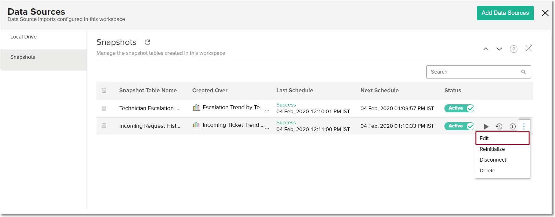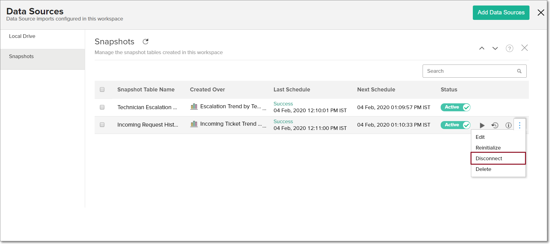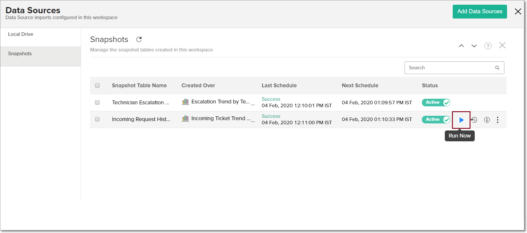 - ワークスペースのサイドパネルの[データソース]をクリックし、[スナップショット] セクションに移動します。