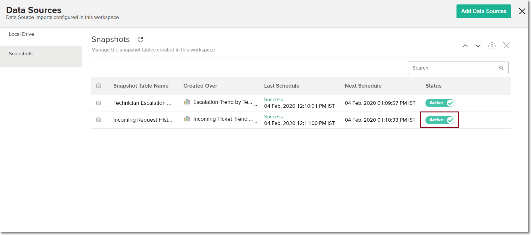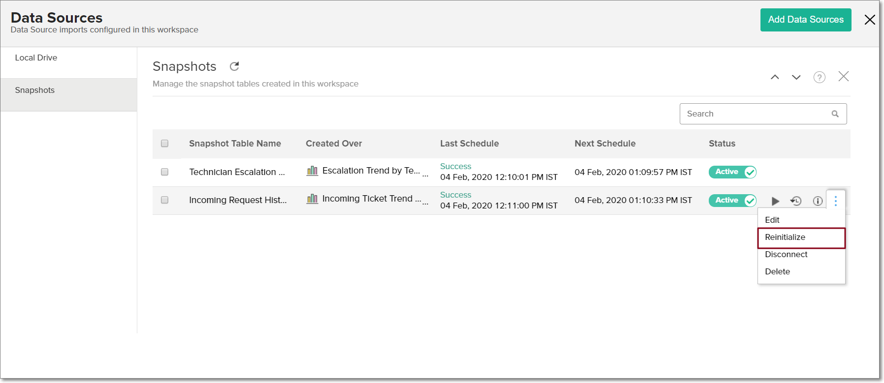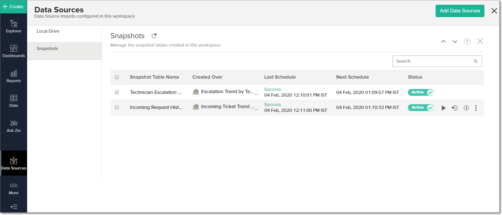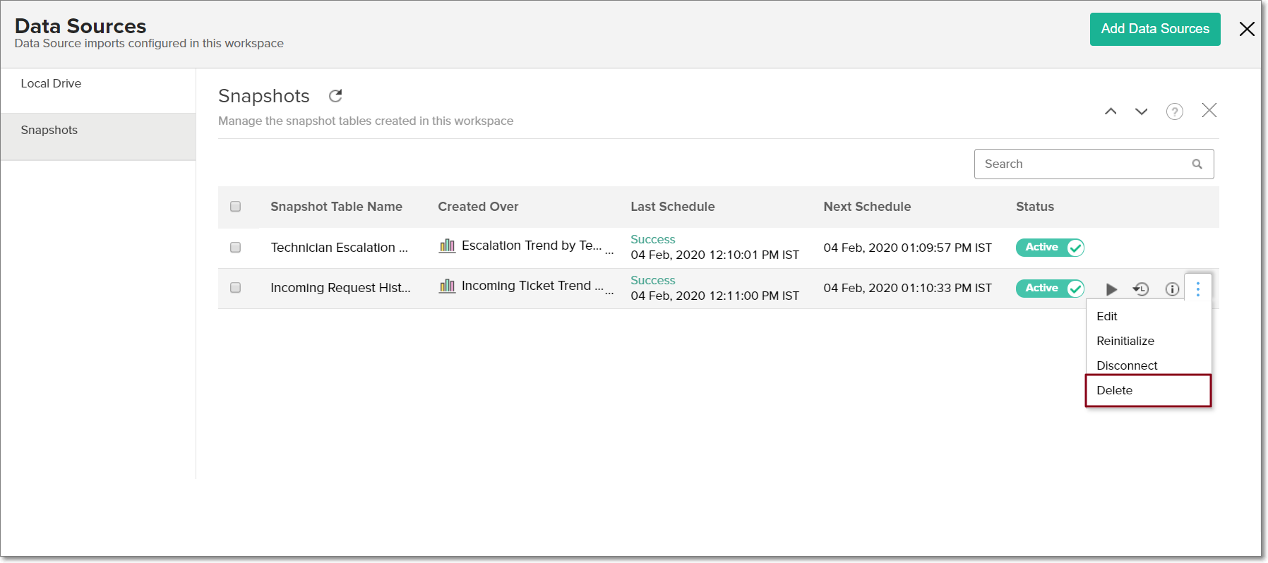 - ワークスペースのサイドパネルの[データソース]をクリックし、[スナップショット] セクションに移動します。