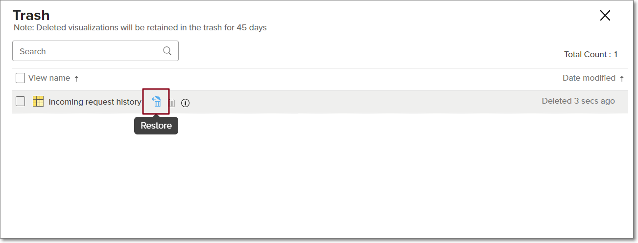スナップショットが作成されたレポートがまだ使用可能な場合は復元できます。復元するには、サイドパネルの[ゴミ箱]をクリックし、対象のテーブルを検索して、マウスオーバーさせて表示される[復元] アイコンをクリックします。