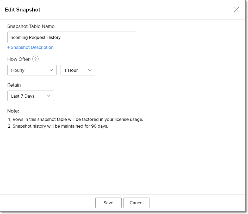- スナップショットが作成されたレポートが削除される、または関係する列がレポートから削除されると、そのデータスナップショットテーブルは復元できません。