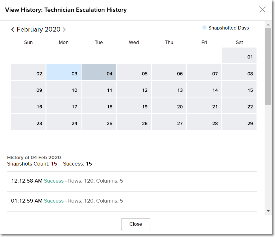 レポートのデータを記録した日がカレンダーに表示されます。特定の日をクリックすると、その日に実行したスナップショットの詳細が表示され、データの取り込み時刻やインポートした行と列の数に関する情報が表示されます。