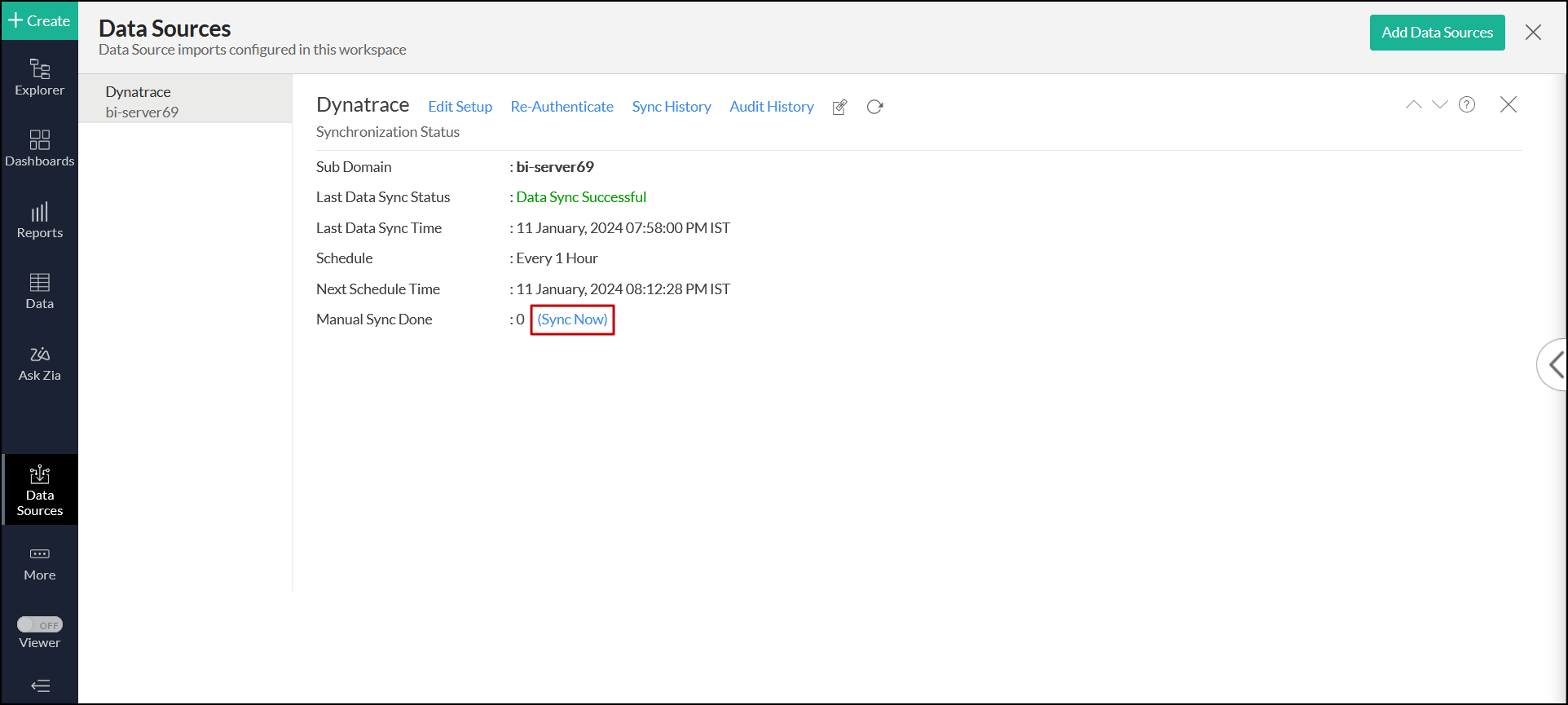 はい。これを行うには、サイドパネルから [データソース] オプションをクリックしてこのページにアクセスします。表示されるページで、Dynatraceソースに移動し、対応する[今すぐ同期]ボタンをクリックします。