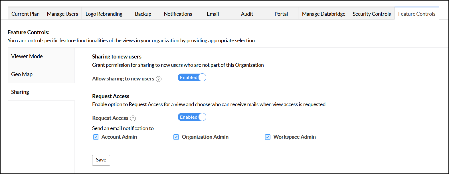 ワークスペース管理者と共有ユーザーが、組織に属さない新しいユーザーとレポートを共有できるか設定できます。