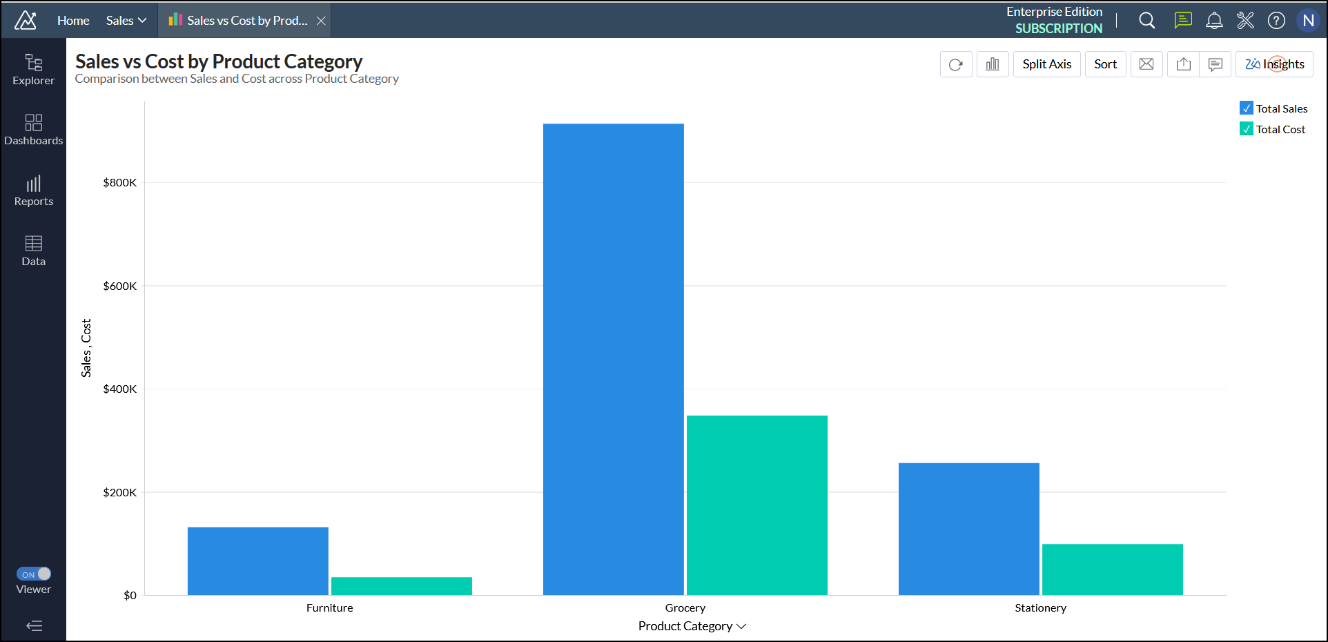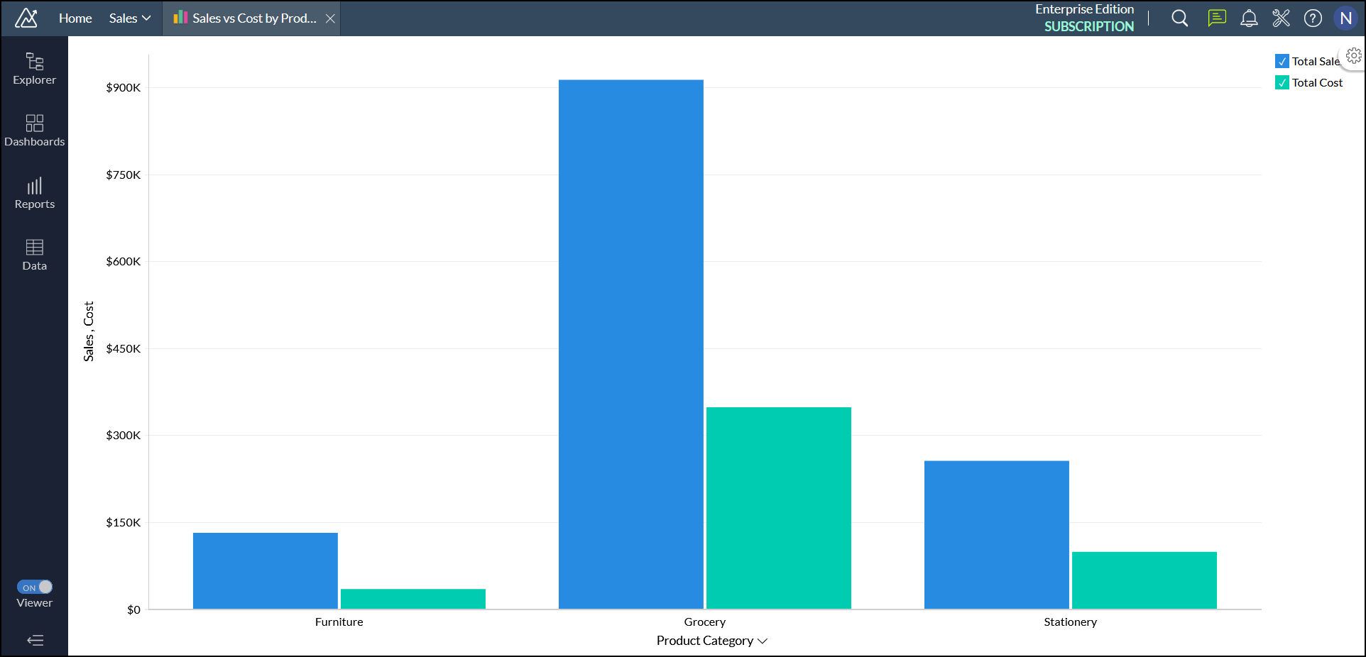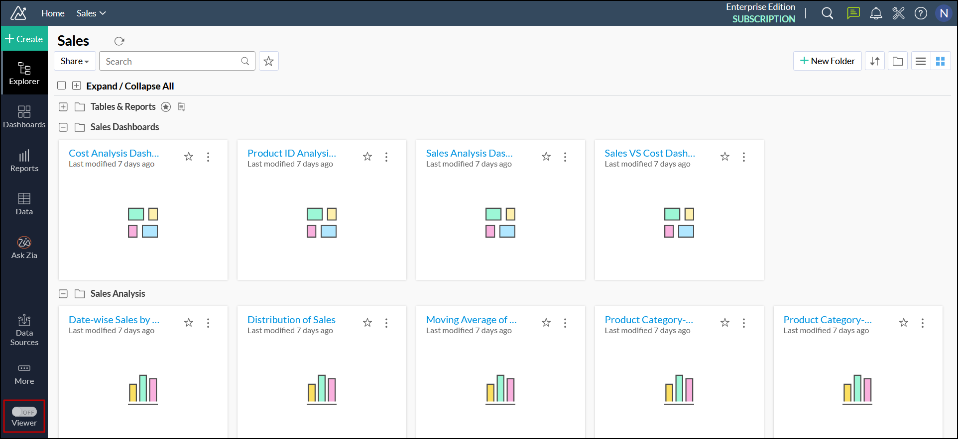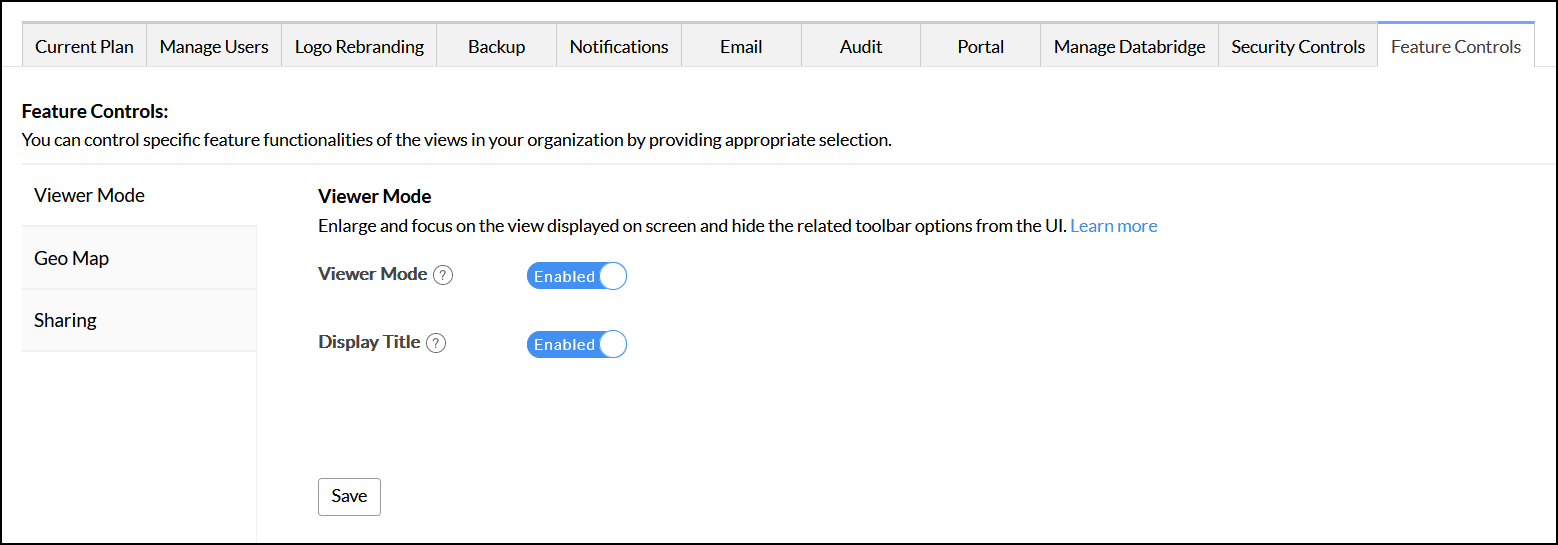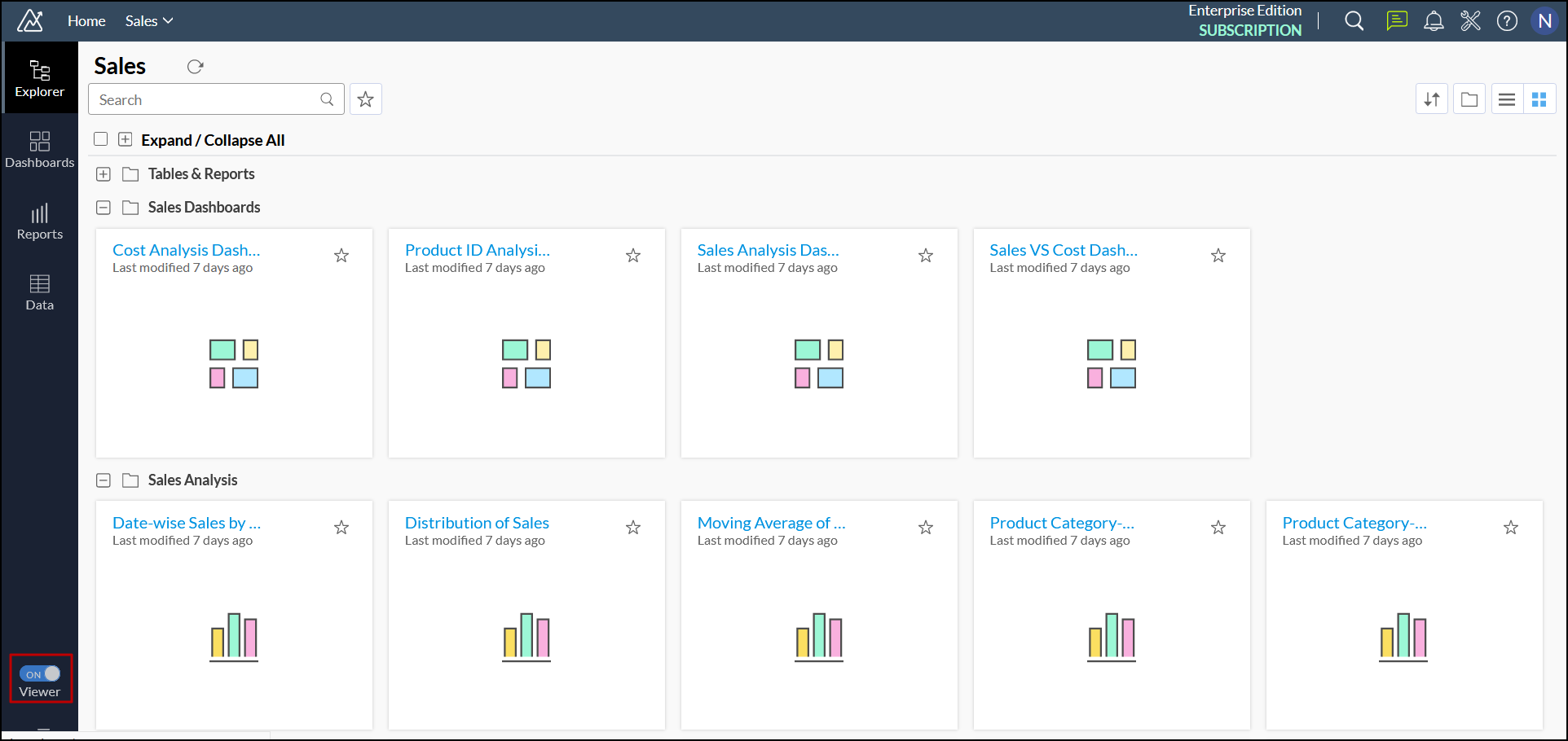 表示モードトグルを使用して、ワークスペースで閲覧者モードを許可するかどうか設定します。閲覧者モードでは、レポート作成や編集メニューは表示されず、表示用として画面を最適化します。