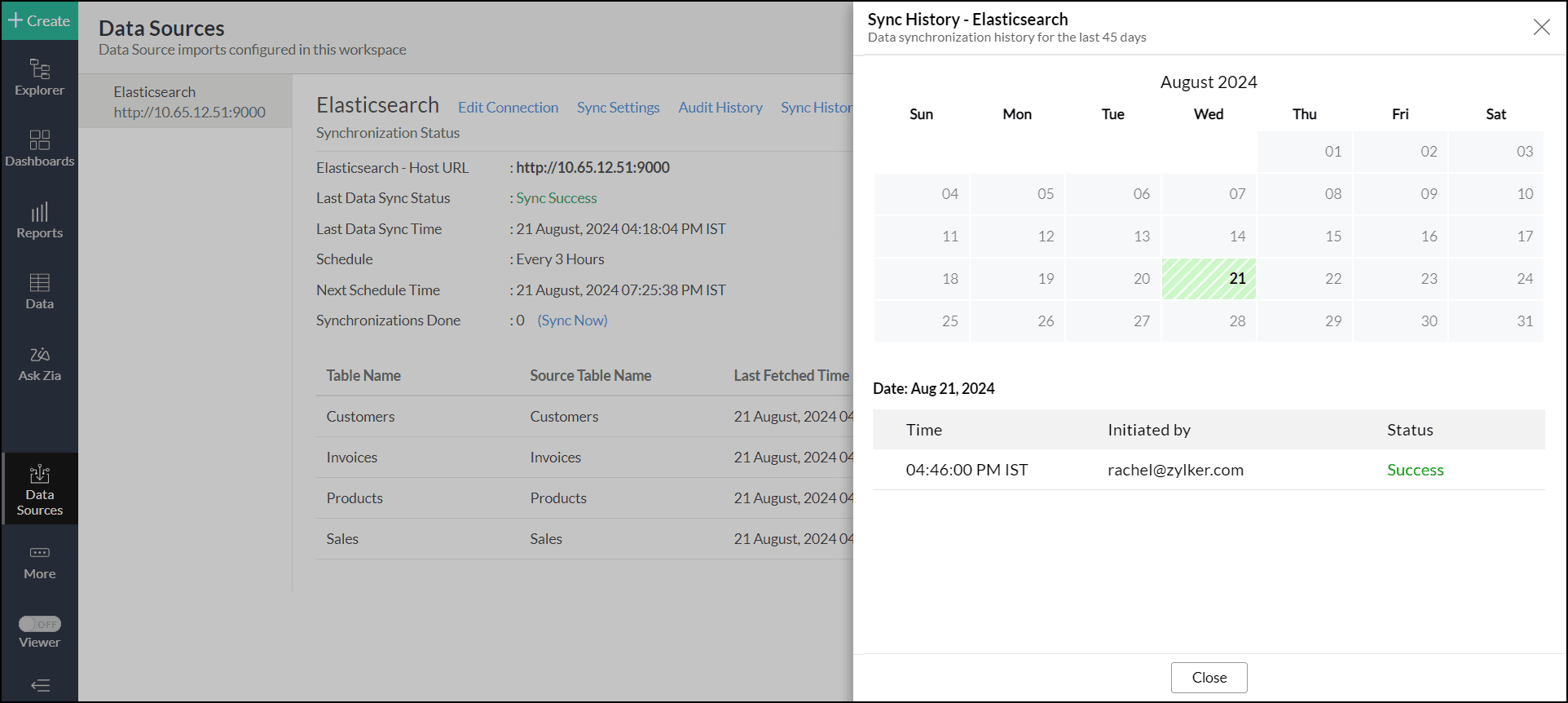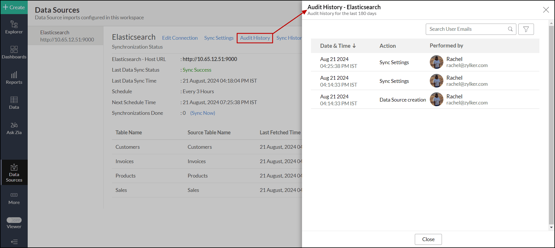 Analytics Plusには、各種ソースからデータ同期について実行したすべての操作の詳細レコードがあります。この履歴では、実行した管理者についての情報と実行された操作のタイプがタイムスタンプ付きで表示されます。