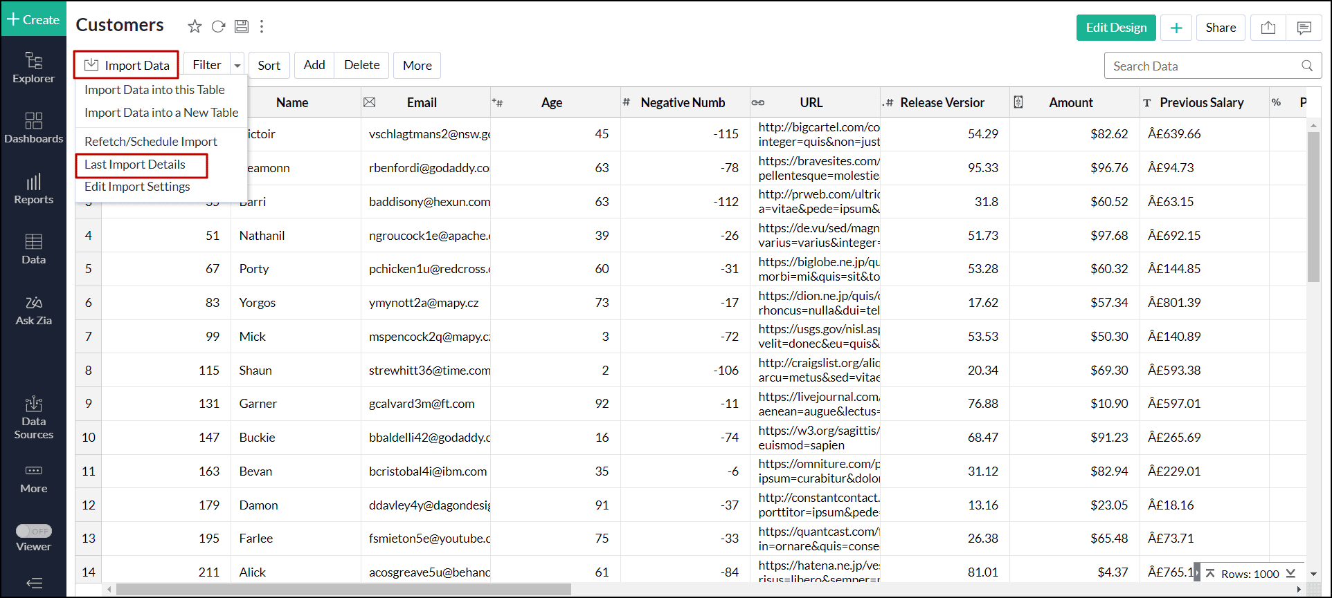 対象のテーブルを開き、[データをインポート] -> [最後のインポートの詳細]オプションを選択して、「インポートの詳細」ページを表示することもできます。