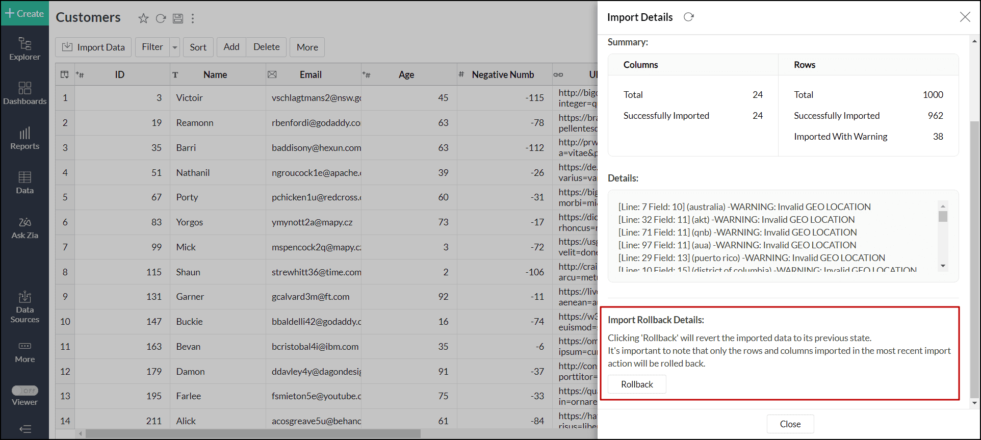 - 新しい列の追加、数式の作成、列の書式設定、ルックアップの定義などのアクションは、インポートのロールバック中に保持されます。