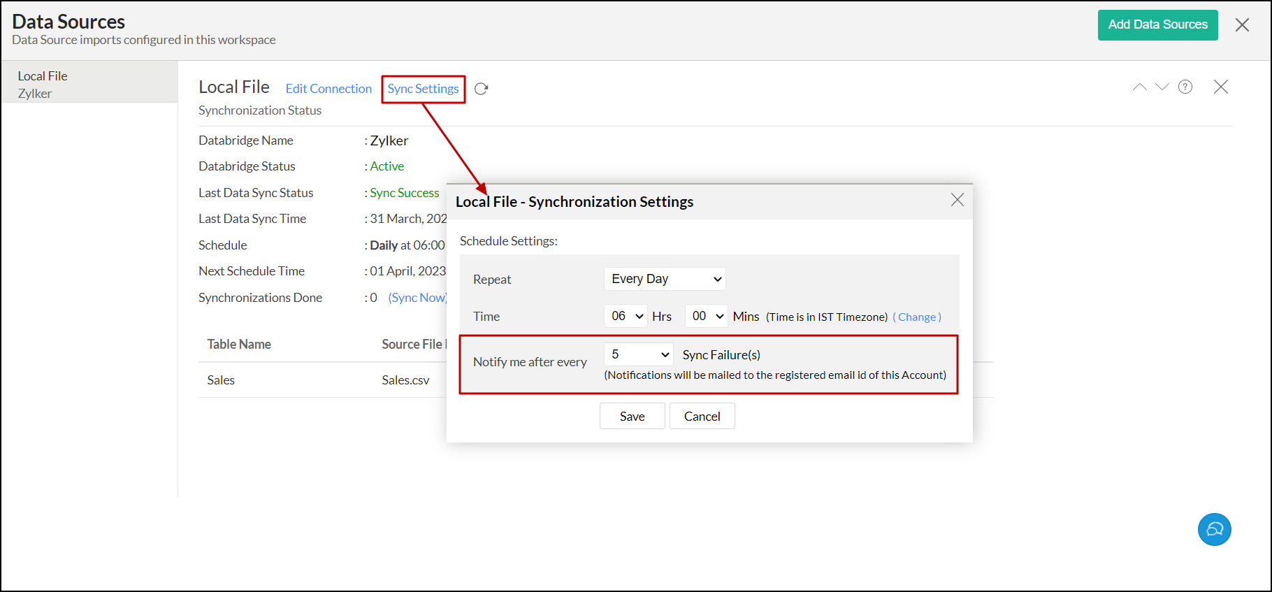 - 「N回の同期失敗ごとに通知する」セクションを使用して、通知がトリガーされる連続インポート失敗回数を指定します。