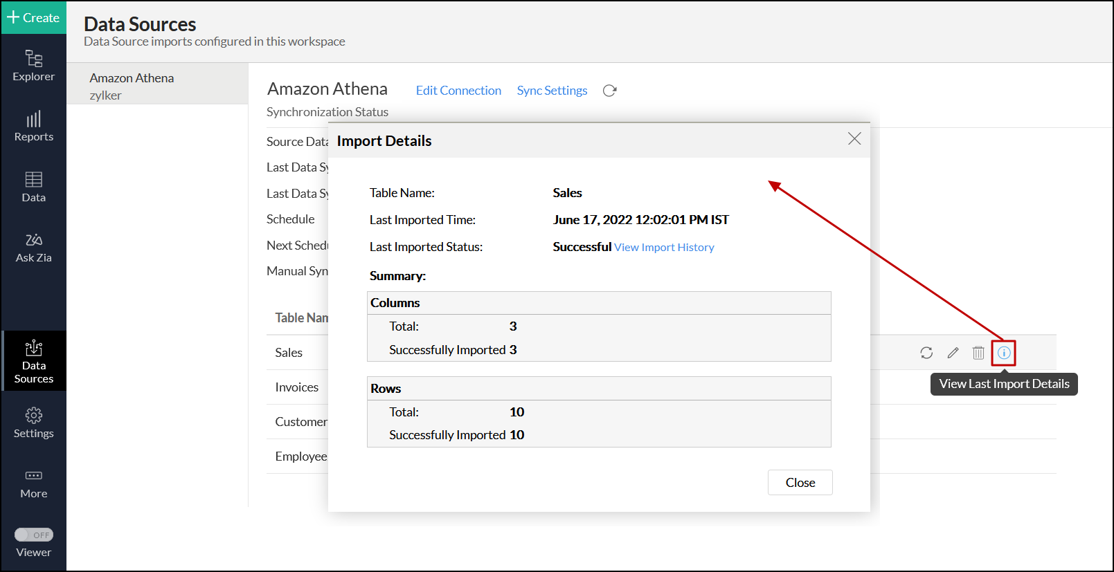 - リストされたテーブルの上にマウスを置いたときに表示される[最後のインポートの詳細を表示]アイコンをクリックします。
