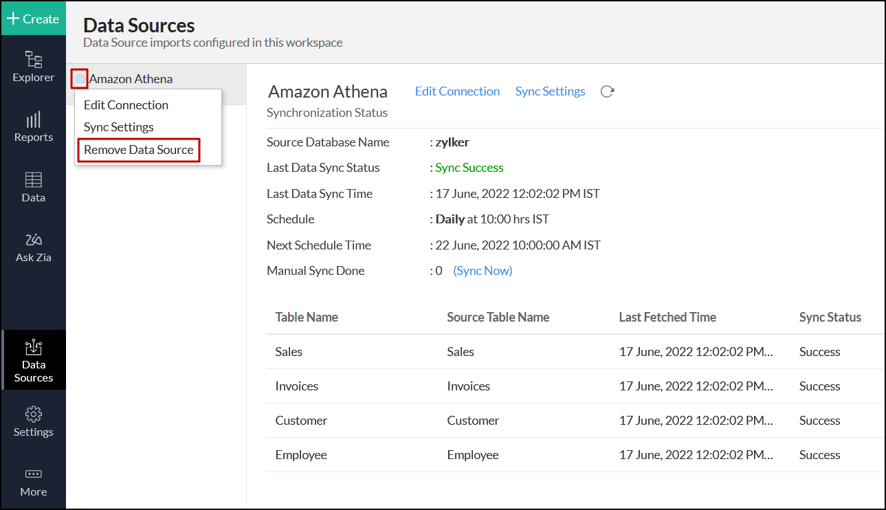 - データソースの名前の上にマウスを置いたときに表示される設定アイコンをクリックし、[データソースの削除]を選択します。