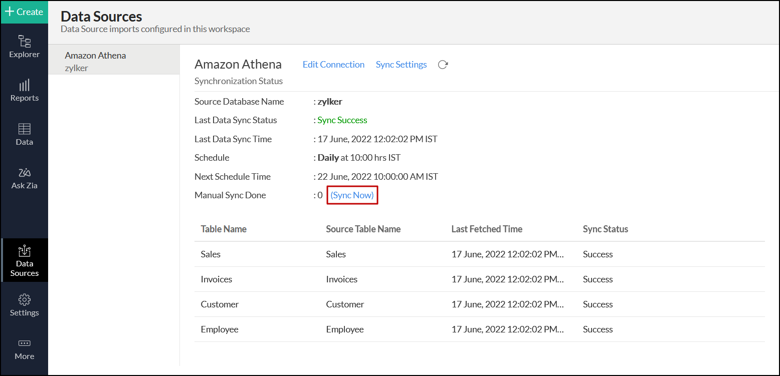 - 対象のAmazon Athenaデータソースに移動し、[今すぐ同期]リンクをクリックします。