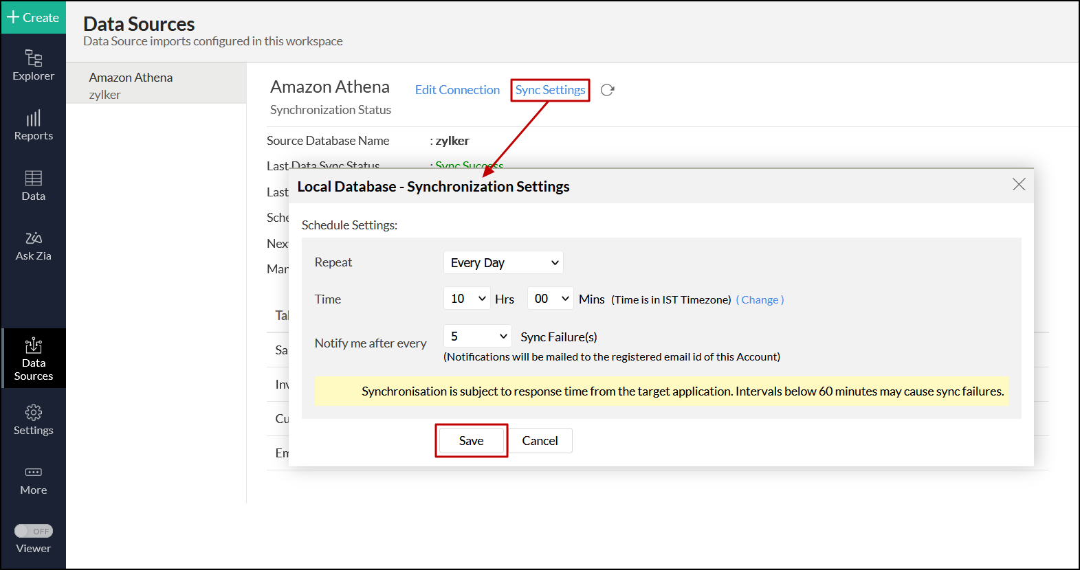 - [保存] をクリックします。Amazon Athenaデータベースのデータは、指定された間隔でAnalytics Plus Cloudにインポートされます。