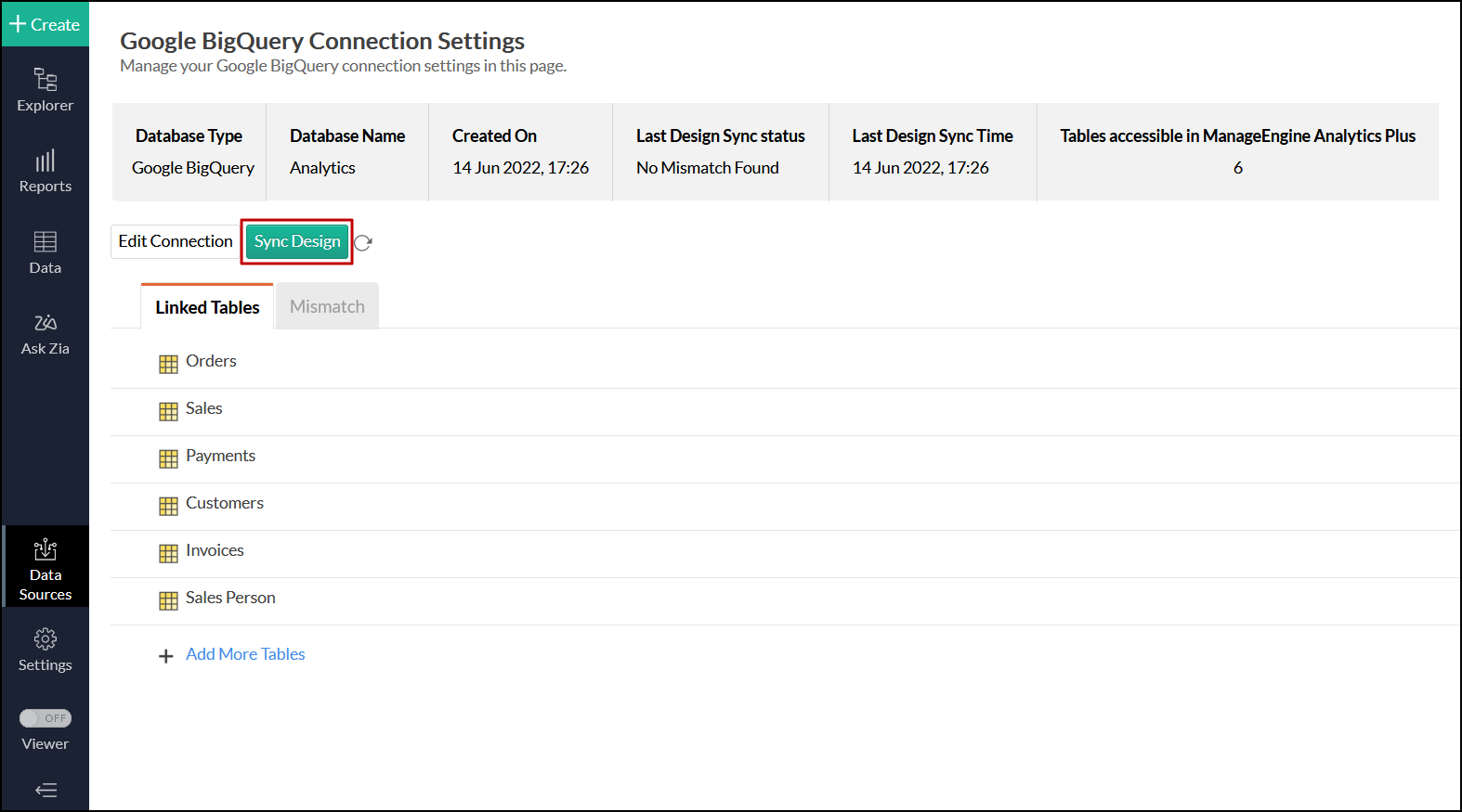 対象のGoogle BigQueryデータソースに移動し、[今すぐ同期]リンクをクリックします。