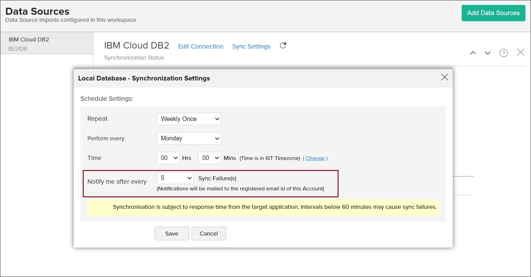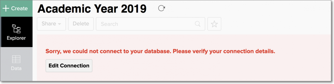 データベースの名前を変更したり削除したりすると、Analytics PlusはIBM Cloudへの接続を失い、次のエラーメッセージが表示されます。