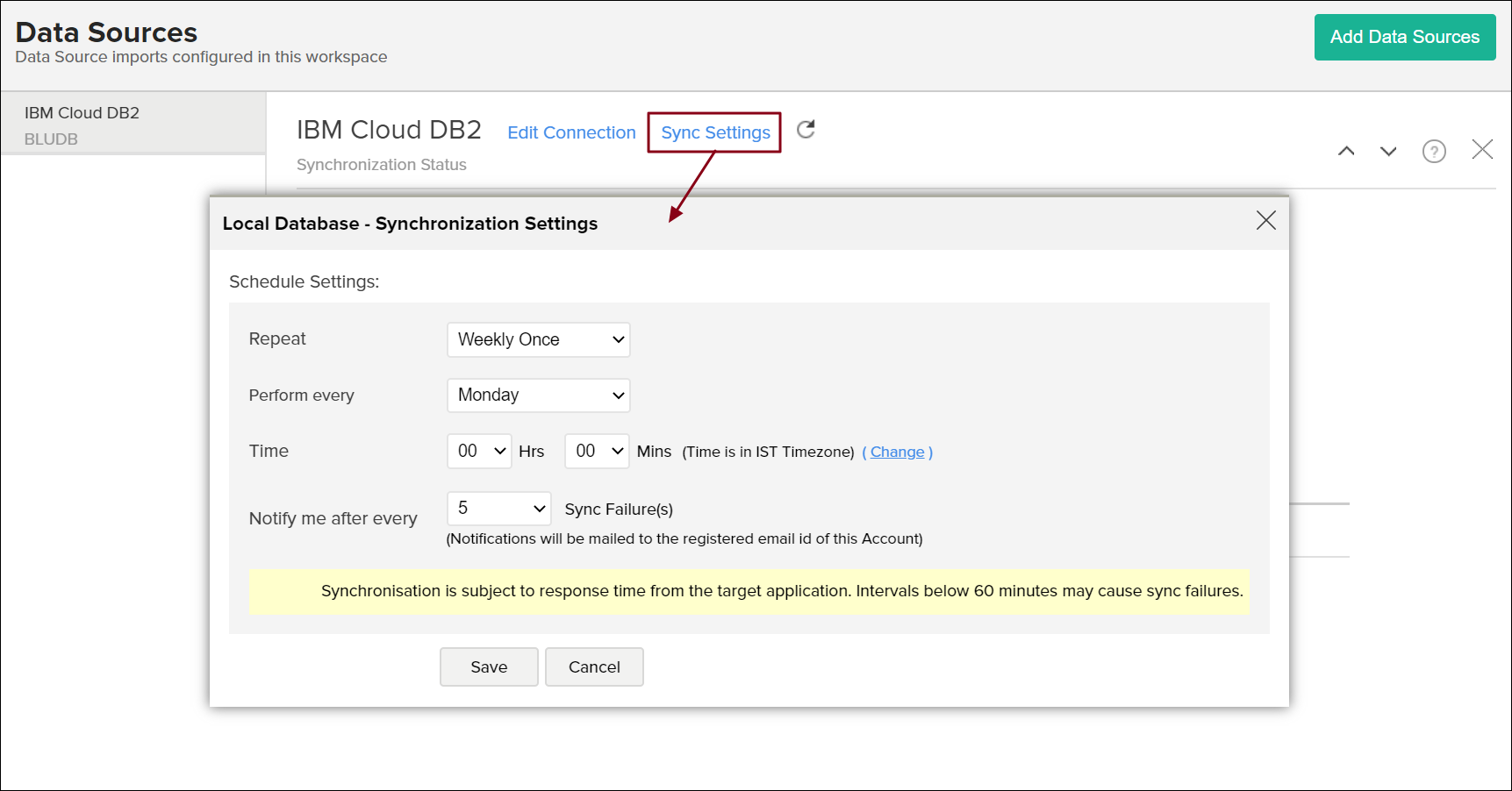 このエラーメッセージは、接続に問題がある場合、またはIBM Cloud認証情報の期限が切れている場合にも表示されます。これを解決するには、表示される [接続を編集する] ボタンをクリックして、必要な設定を変更します。ライブ接続設定を編集する詳細については、「2.ライブ接続設定を編集する方法」を参照してください。