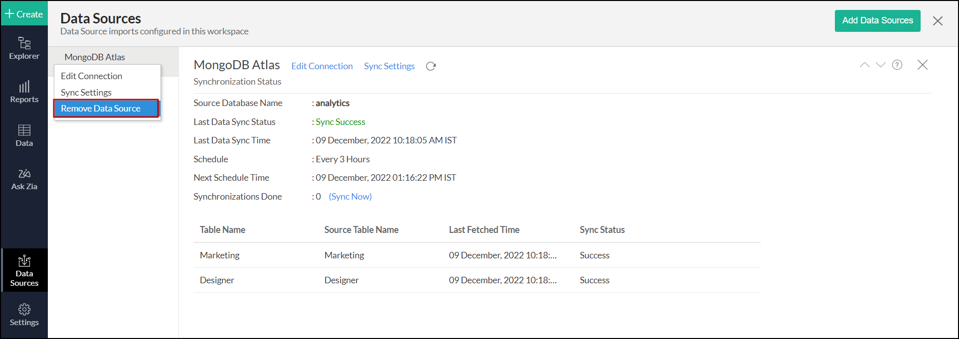メモ:データソースを削除しても、Analytics Plusから対応するテーブルとレポートは削除されませんが、以降の同期は実行できなくなります。