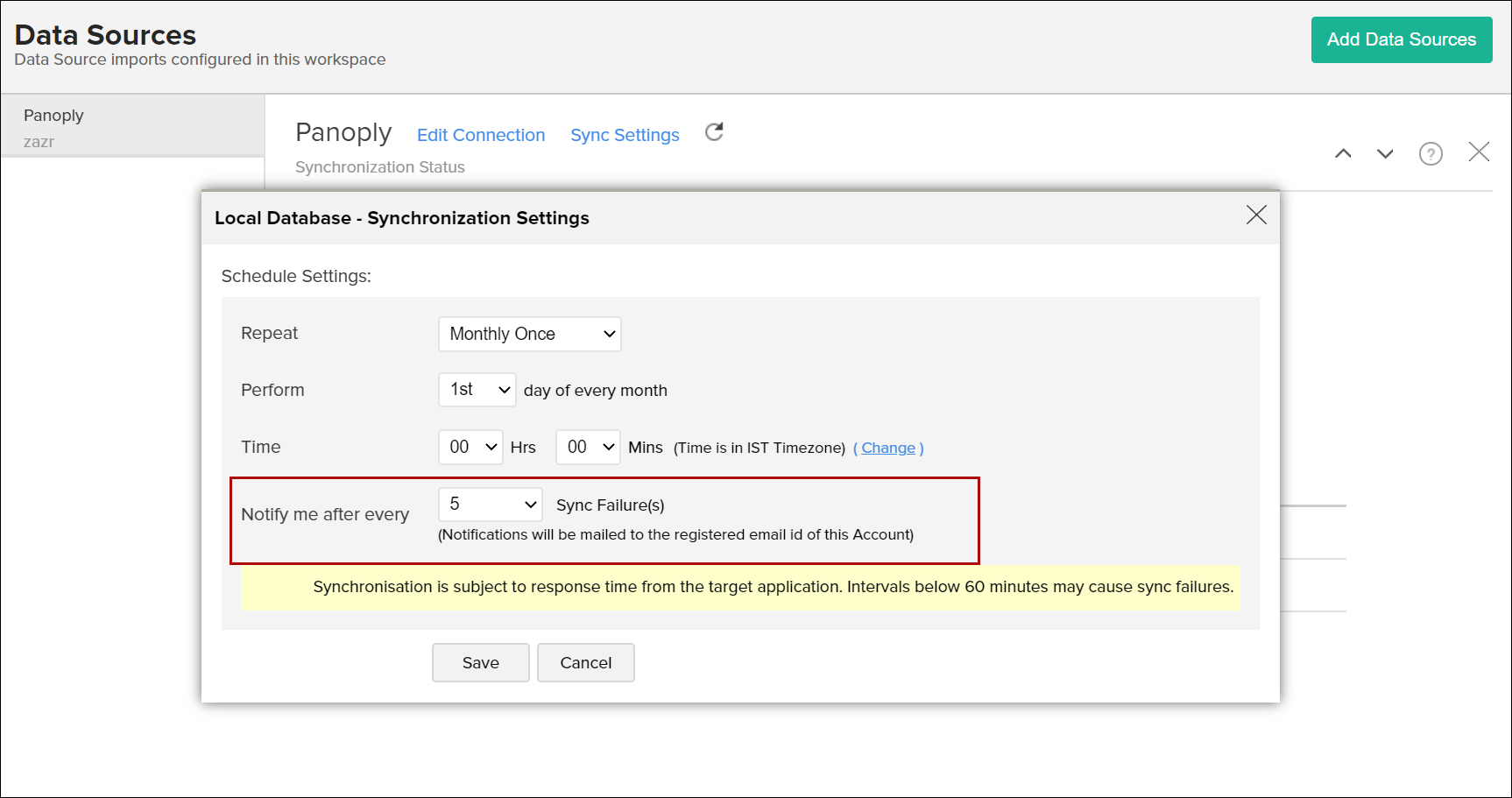 データスケジュールを設定する際に、連続してインポートに失敗した場合に通知を受けるように選択できます。そのためには、