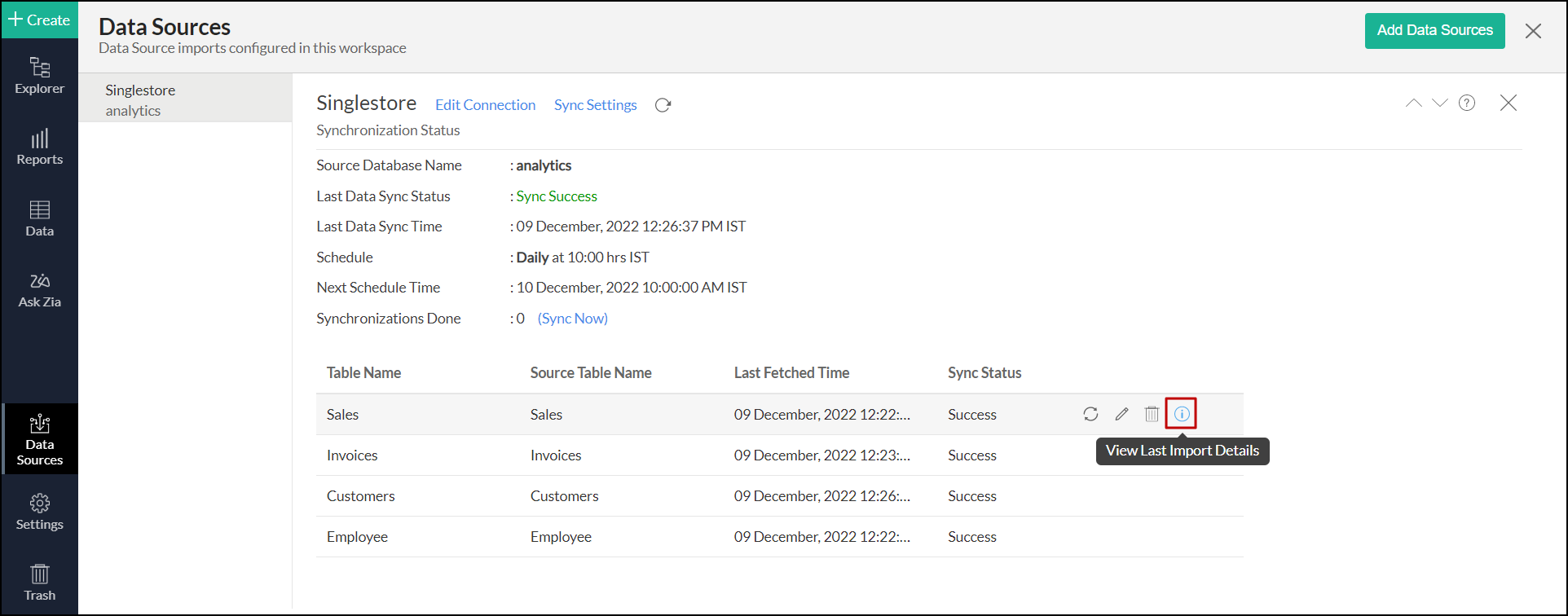 - リストされたテーブルの上にマウスオーバーさせたときに表示される[最後のインポートの詳細を表示]アイコンをクリックします。これにより、「インポートの詳細」ページが開き、同期失敗の理由に関する詳細な情報が表示されます。