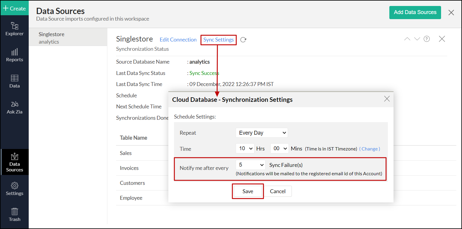 - [保存]をクリックします。Singlestoreデータベースのデータは、指定された間隔でAnalytics Plusにインポートされます。