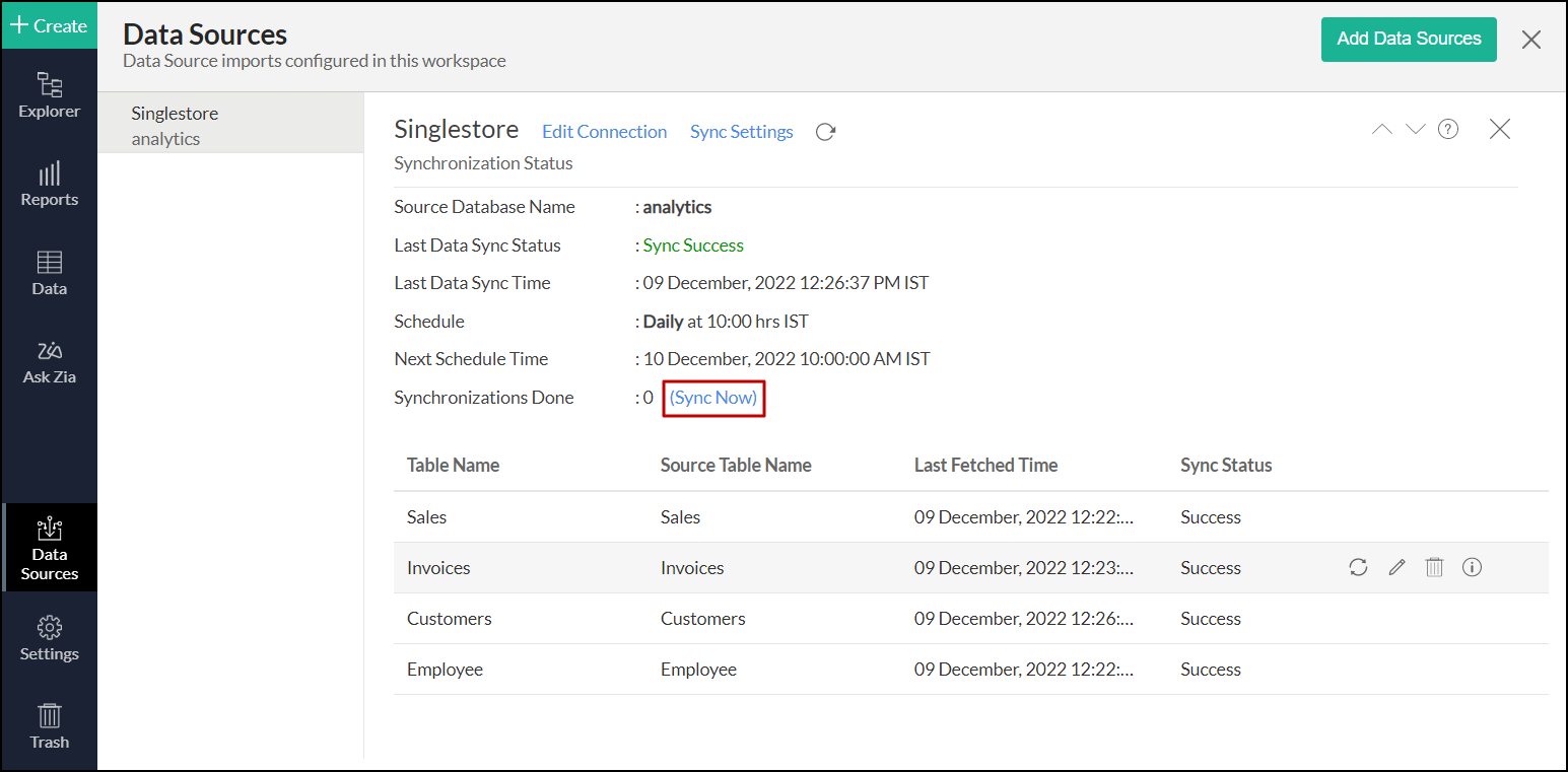 - 対象のSinglestoreデータソースに移動し、[今すぐ同期] リンクをクリックします。