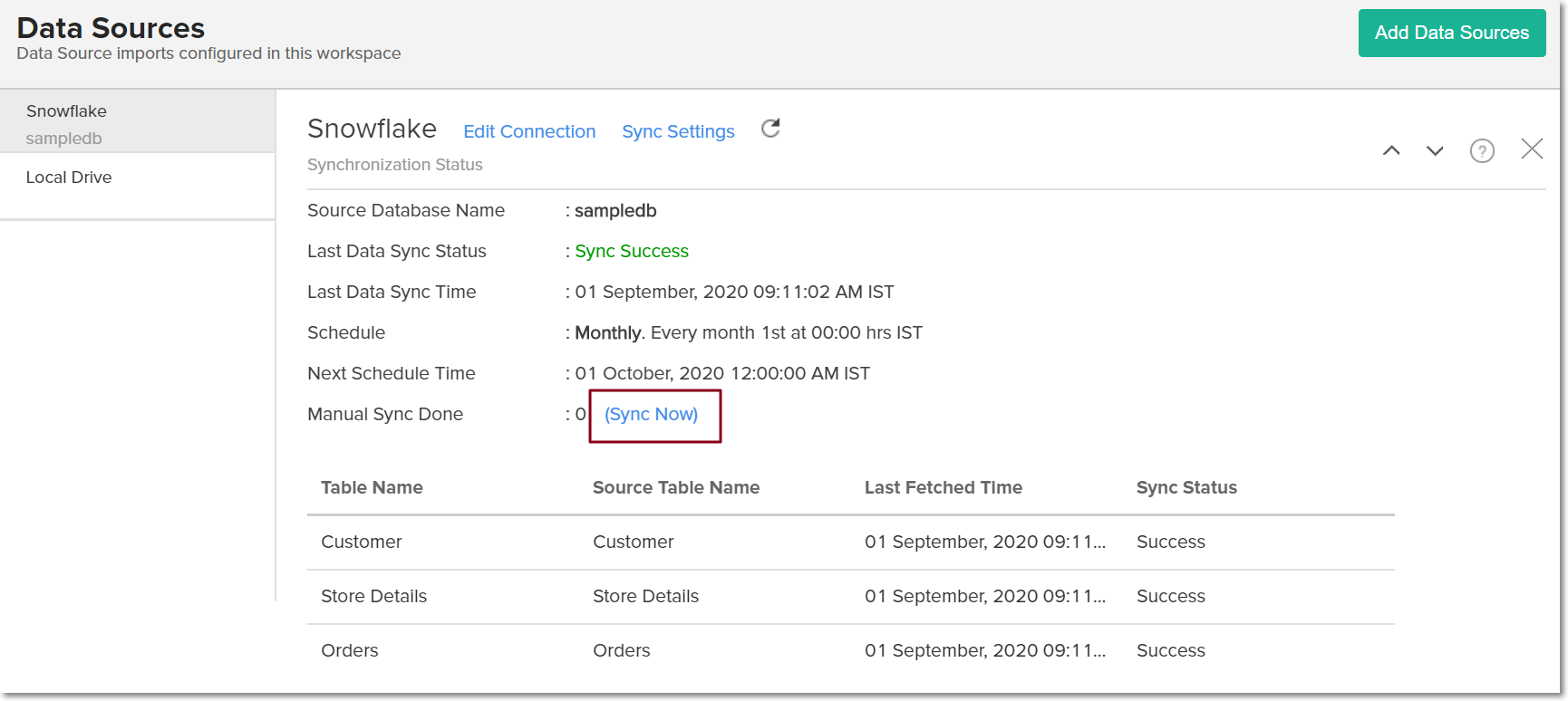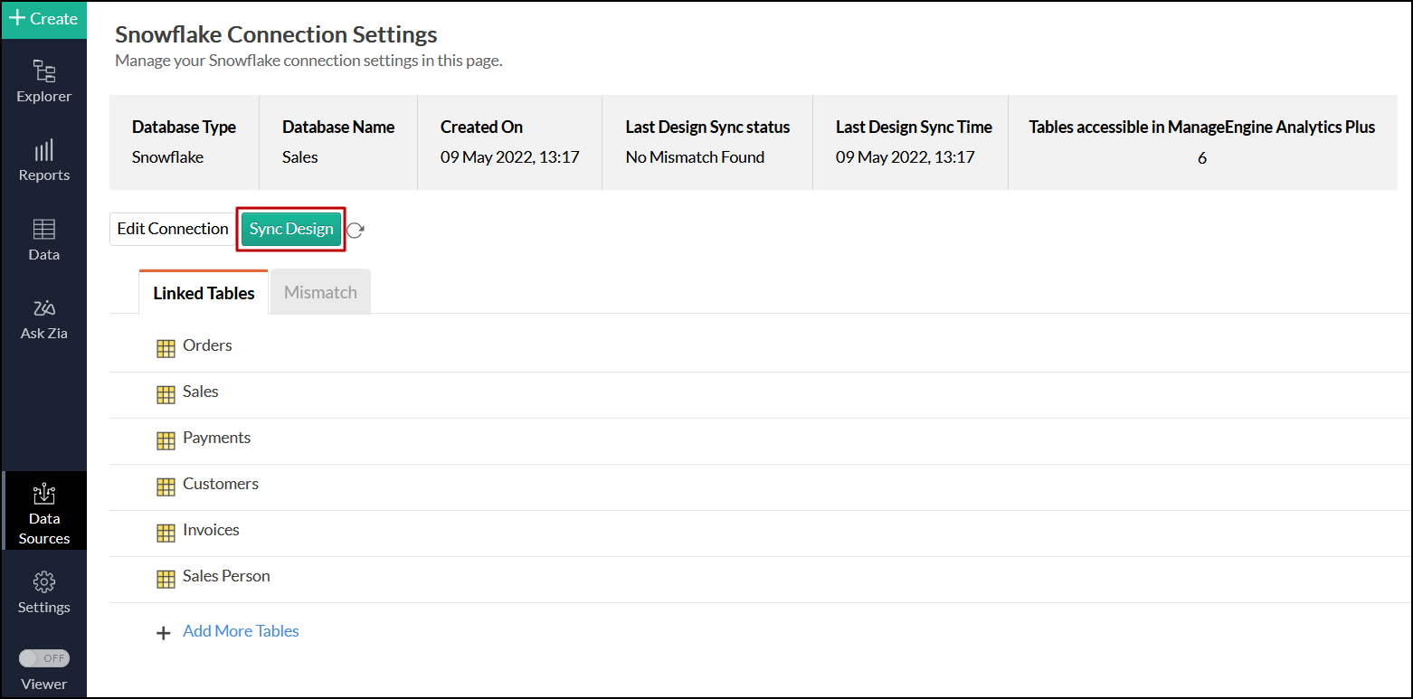 はい。これを行うには、サイドパネルから [データソース] オプションをクリックし、[テーブルの追加] をクリックして、新しく追加されたテーブルをSnowflakeデータベースからAnalytics Plusにリンクします。