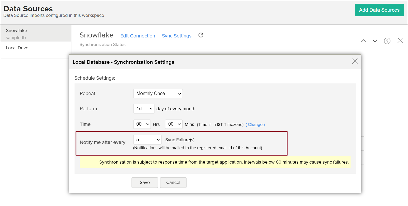 データスケジュールを設定する際に、連続してインポートに失敗した場合に通知を受けるように選択できます。そのためには、