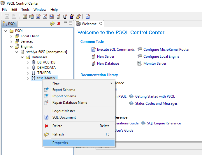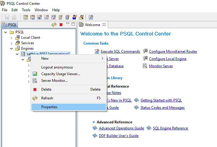 - Pervasive SQL コントロール センターを開きます。エンジン名を右クリックし、[プロパティ] をクリックします。