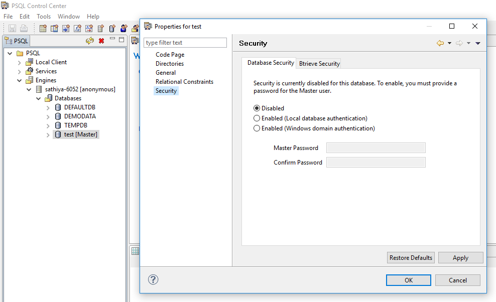 - Pervasive PSQL Explorer で、ツリーの最上位ノード (Pervasive PSQL) を右クリックします。