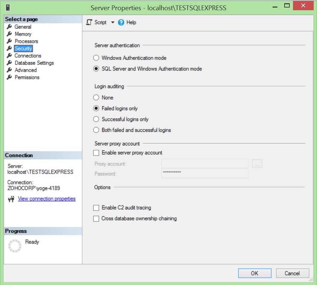 - Analytics Plus は、MSSQL サーバーに接続するために Windows 認証と SQL 認証の両方をサポートしています。SQL または Windows 認証を使用する場合は、セキュリティ設定で SQL サーバーおよび Windows 認証モードが有効になっていることを確認してください。