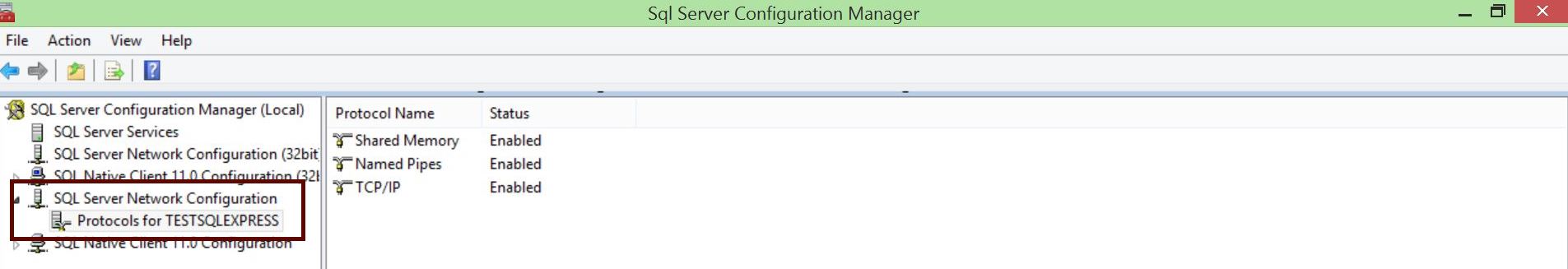 - SQL Server 構成マネージャー ページで、SQL Server ネットワーク構成オプションをクリックし、必要な SQL Server インスタンス名を選択して、共有メモリ、名前付きパイプ、および TCP/IP プロパティを有効にします。
