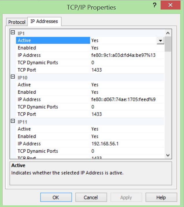 - TCP/IP を右クリックし、[プロパティ]に移動して、[IP アドレス]タブに進みます。[アクティブ] および [有効] フィールドが [はい] に設定されていることを確認し、TCP/IP ポートを構成します。[OK] をクリックして続行します。