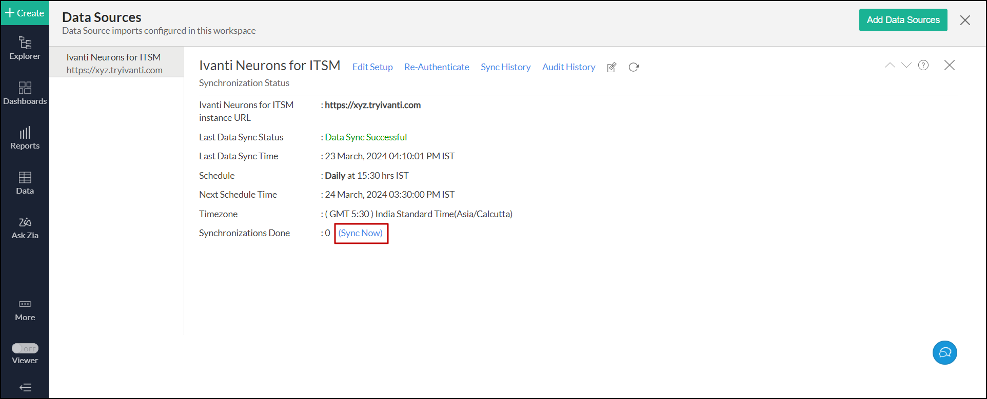 はい。これを行うには、サイドパネルから [データソース] オプションをクリックしてこのページにアクセスします。表示されるページで、Ivanti Neurons for ITSMソースに移動し、対応する[今すぐ同期]ボタンをクリックします。