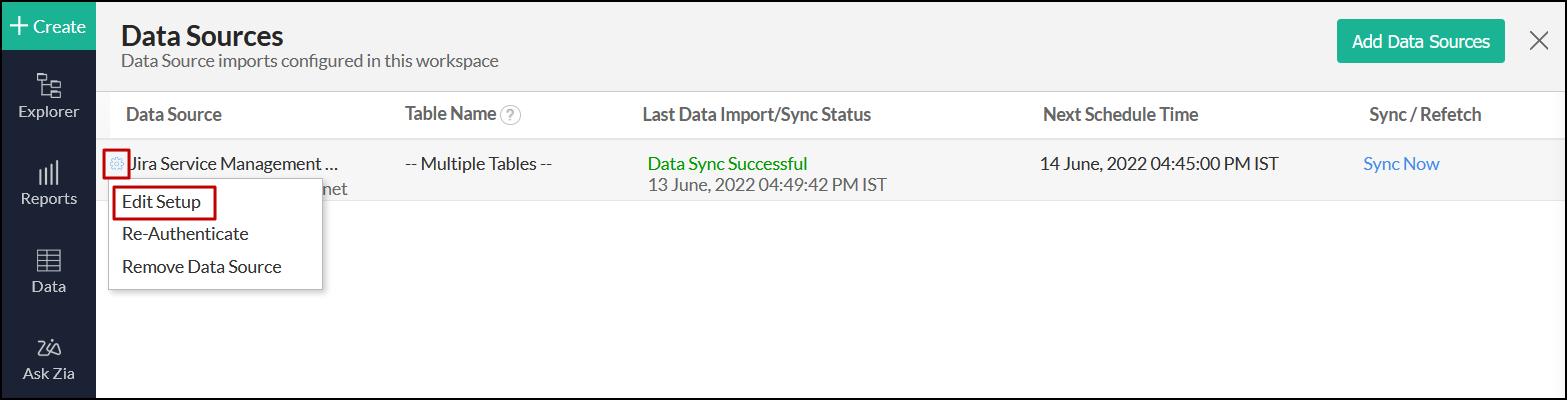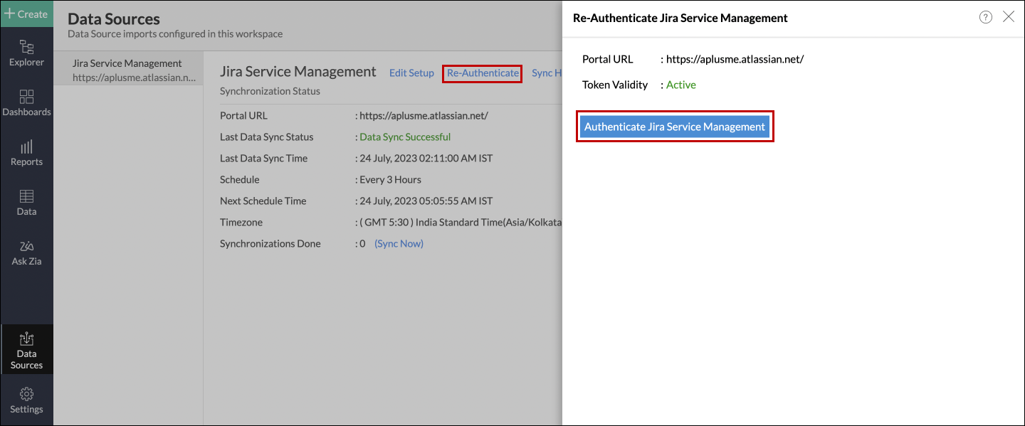 Jira Service Managementデータソースに移動し、[再認証]リンクをクリックします。