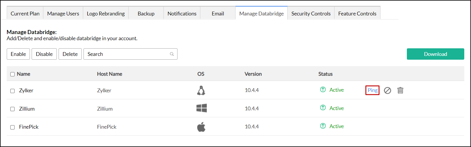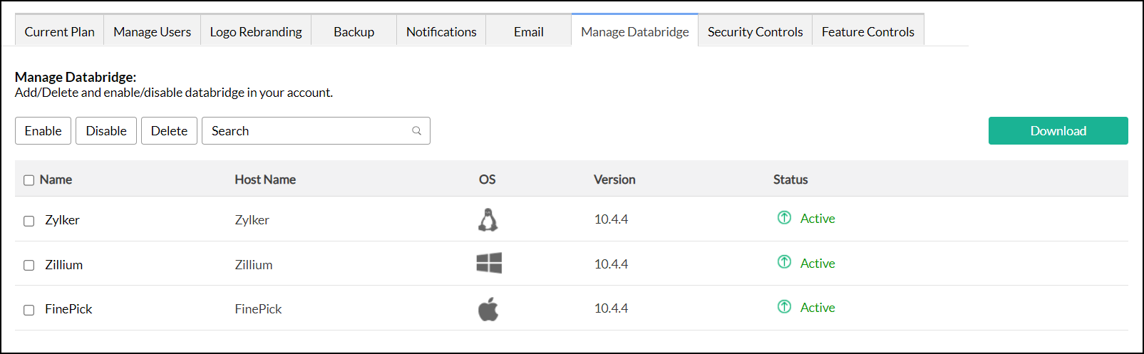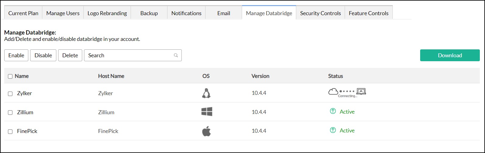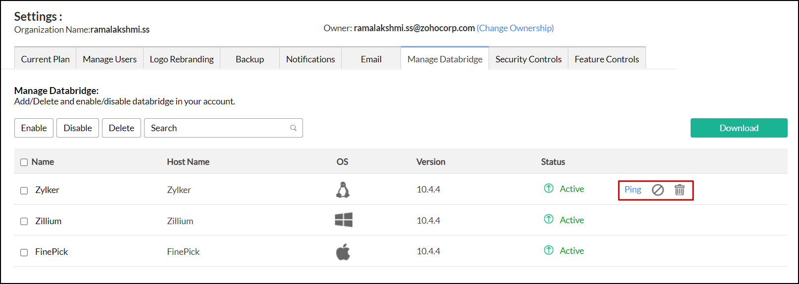 - Analytics Plusには、利用中のアカウントにリンクされたすべてのManageEngine Databridgeインストールが、名前、バージョン、ホスト名、OSおよびステータス情報とあわせて一覧表示されます。このページから次の操作を実行できます。