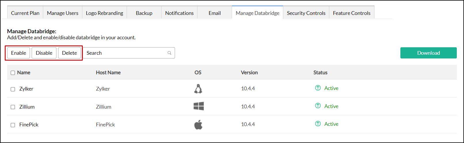 - 対象のDatabridge(複数可)を選択し、該当のオプションをトップバーから選択して、有効化、無効化、または削除を実行します。