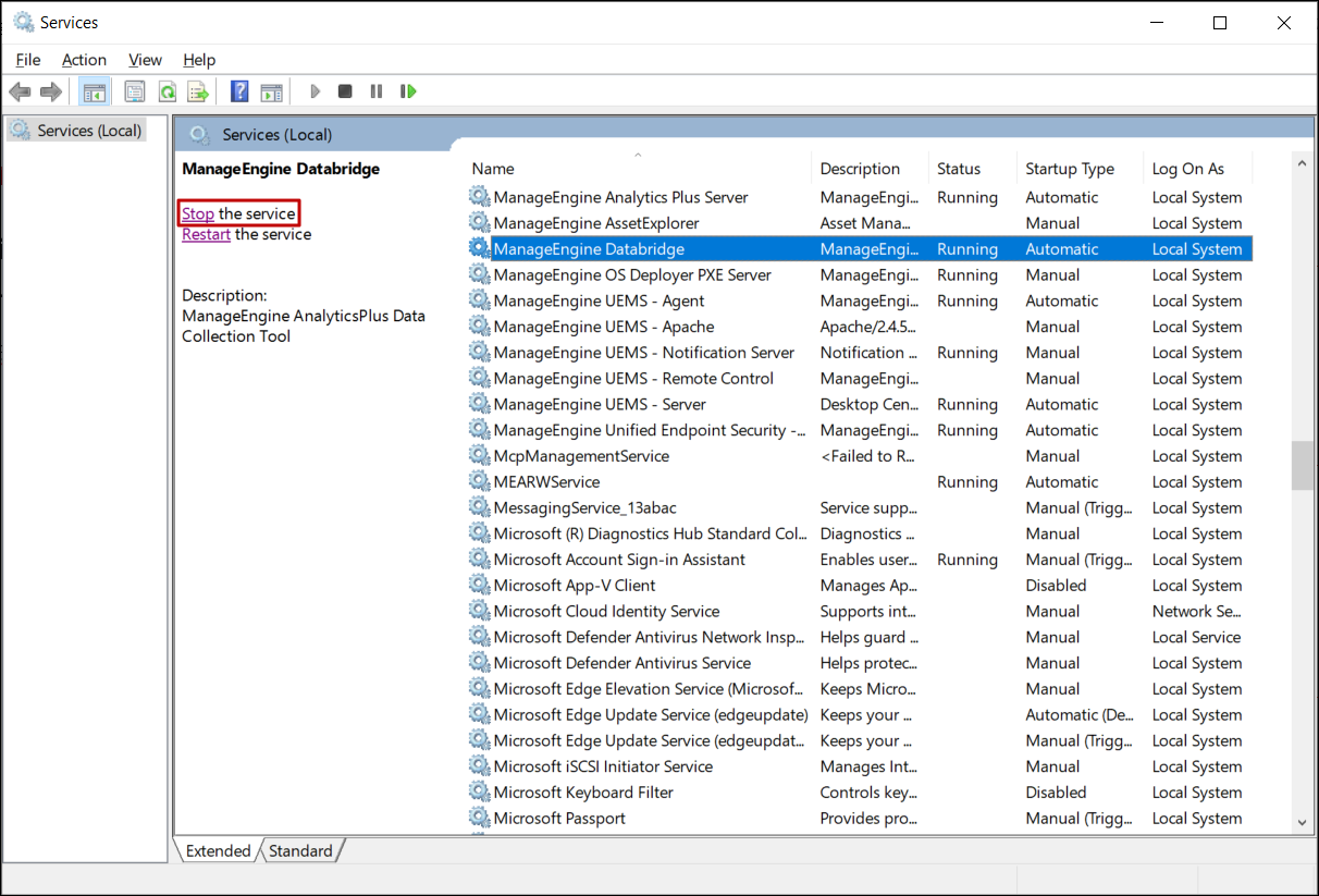 - Windows Servicesを開き、ManageEngine Databridgeサービスに移動します。