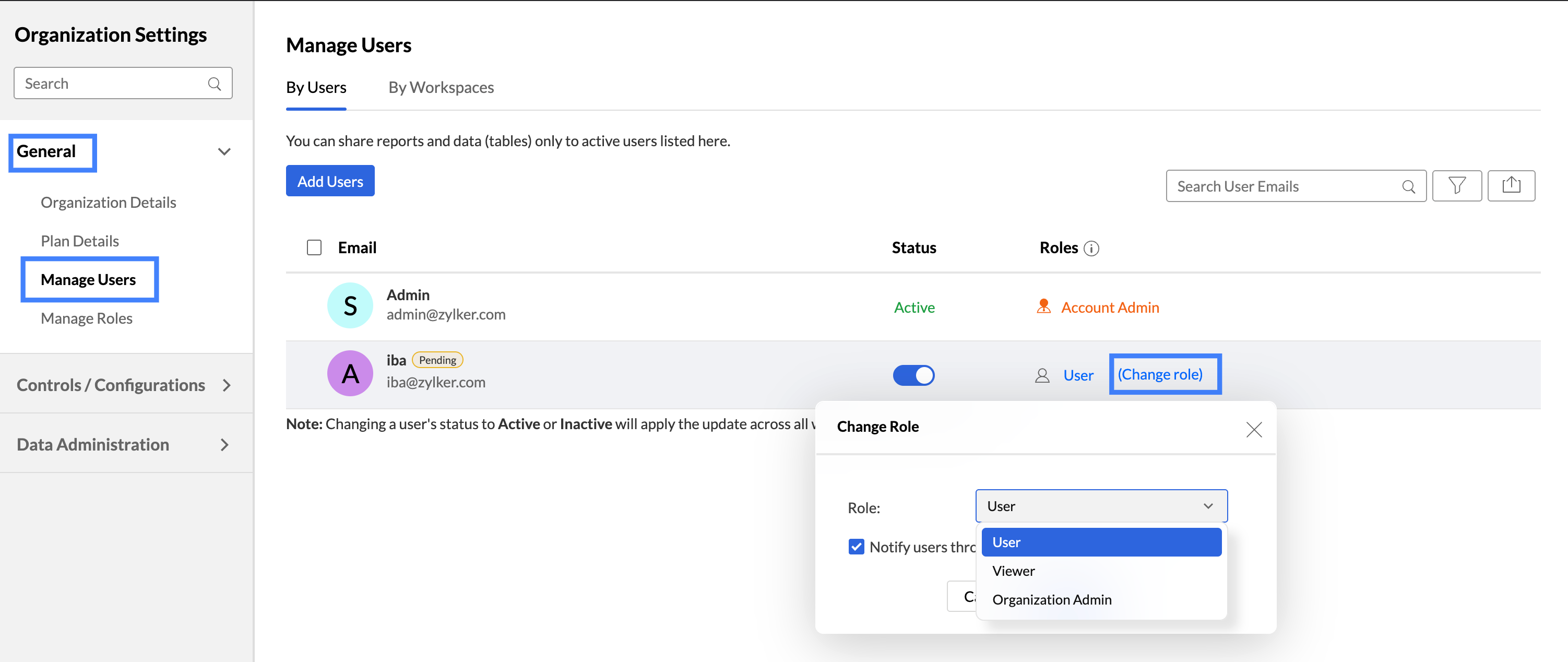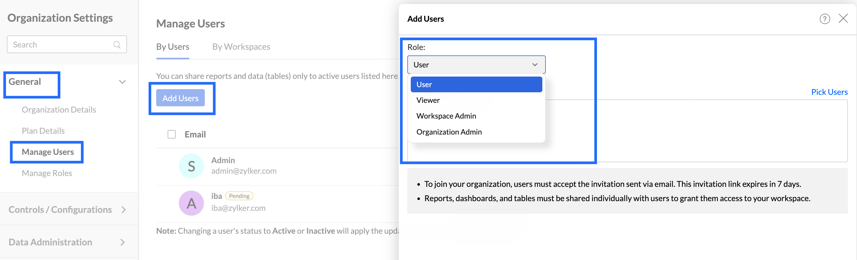 ユーザーを組織管理者、ワークスペース管理者、ユーザー、閲覧者として分類するか、カスタムロールを割り当てることができます。ユーザーロールおよびアクセス権限の詳細は、ユーザー管理を参照してください。。