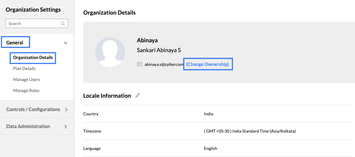 - 組織の詳細画面で[所有権を変更する]をクリックします。