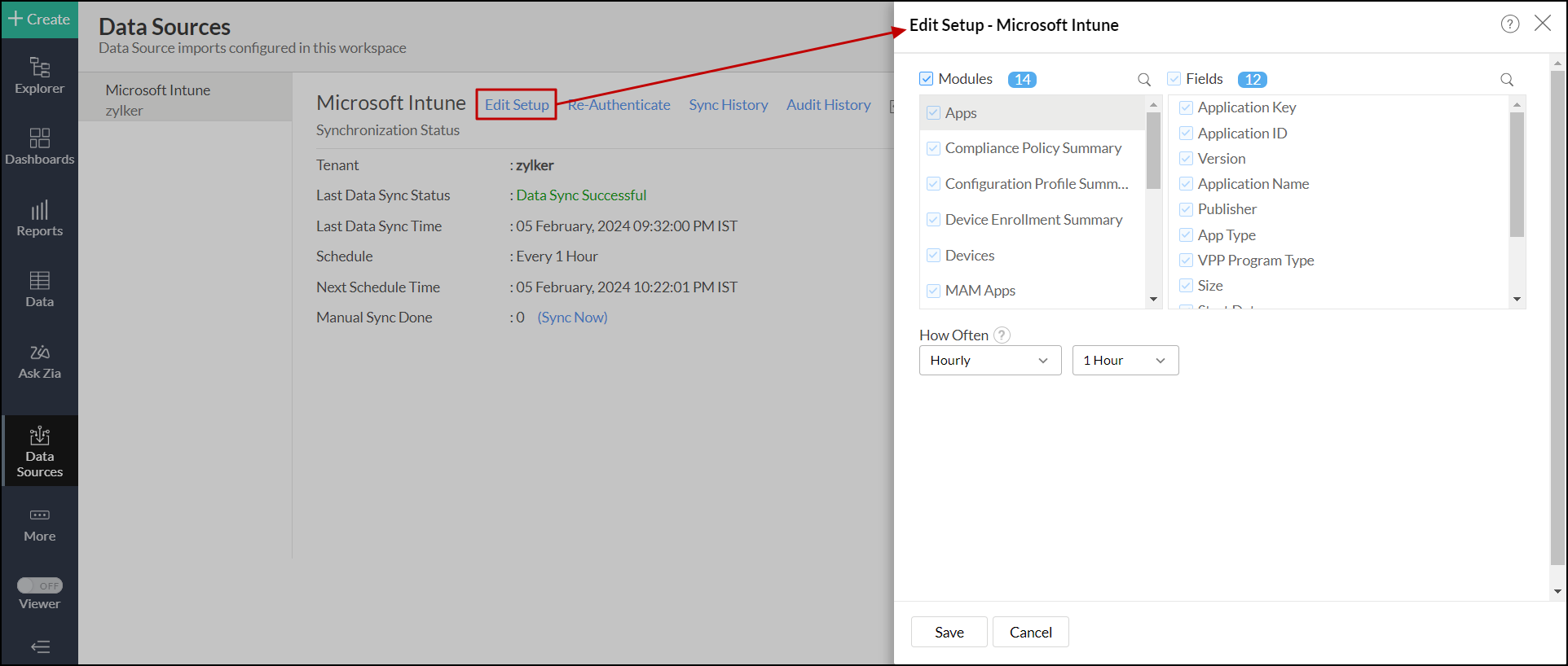 - Microsoft Intuneデータソースに移動し、[セットアップを編集]リンクをクリックします。