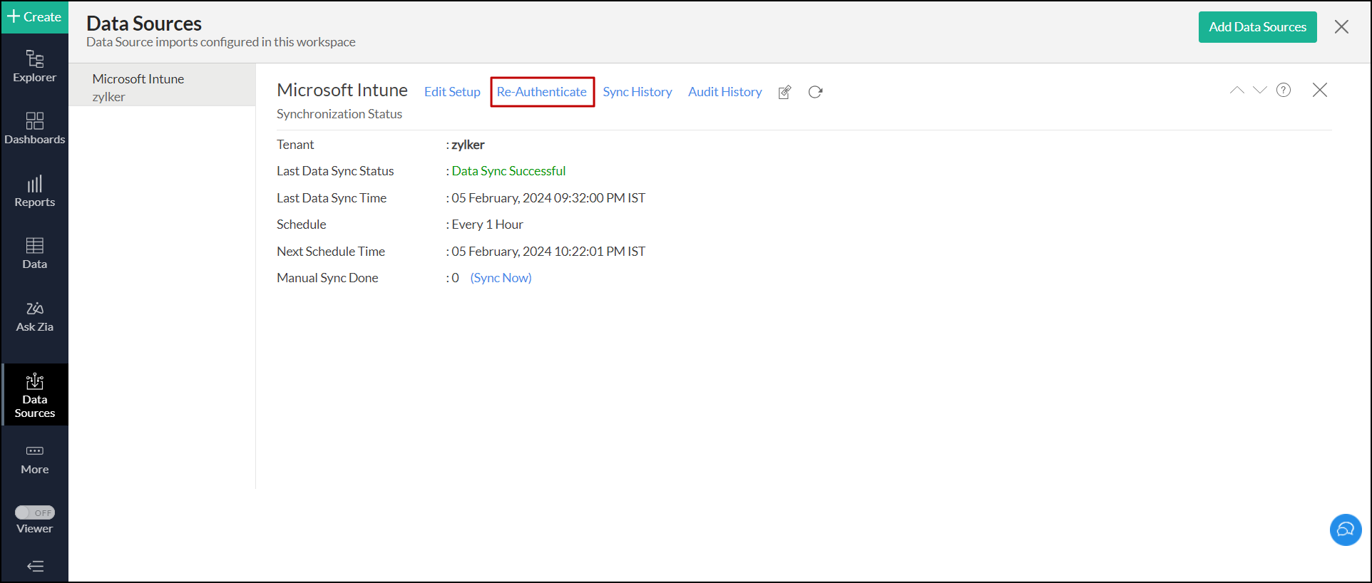 - Microsoft Intuneデータソースに移動し、[再認証]リンクをクリックします。