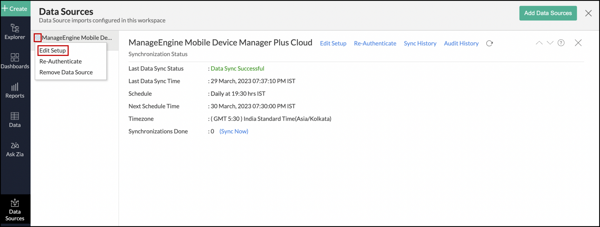Mobile Device Manager Plus Cloudデータソースに移動し、[セットアップを編集]リンクをクリックします。