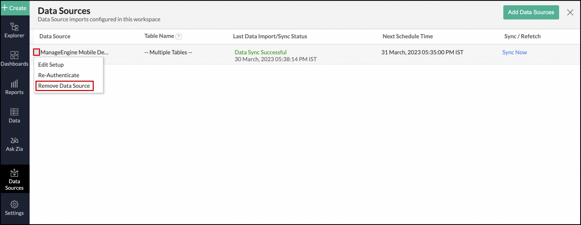 はい。これを行うには、サイドパネルの[データソース]オプションをクリックします。表示されるページで、Mobile Device Manager Plus Cloudソースに移動し、対応する[今すぐ同期]ボタンをクリックします。